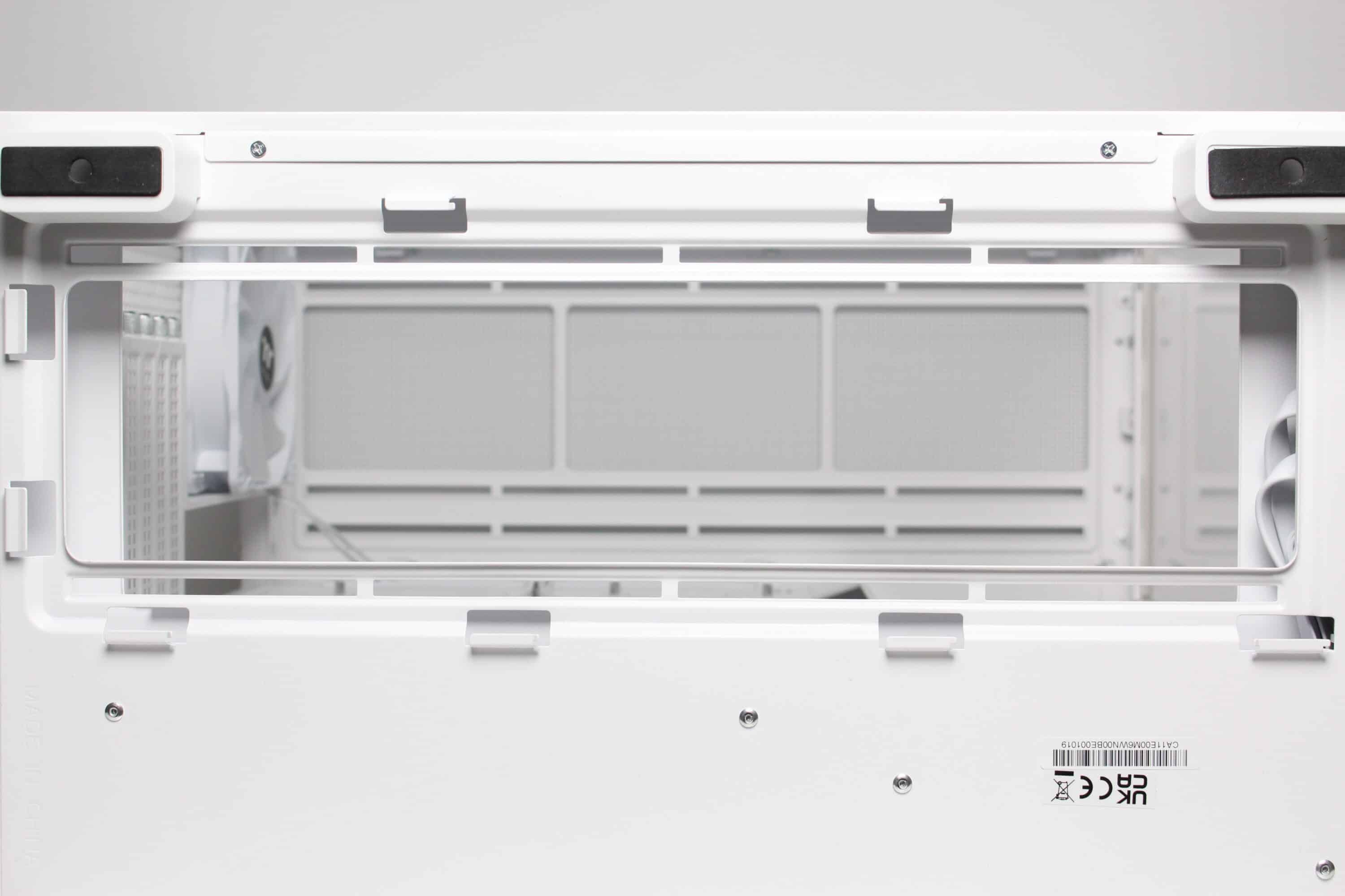 Die Oberseite des View 380 XL TG ARGB wurde sehr luftig gestaltet. Zu erkennen ist hier ein großes Lüftergitter, welches zusammen mit dem zweiten Deckelelement werkzeuglos mittels Rändelschrauben entfernt werden kann. Das Lüftergitter besteht aus Stahl, wohingegen das zweite Elemente lediglich als Blende dient und aus Kunststoff gefertigt ist. Unter dem Lüfterrahmen gibt es einen weiteren Montagerahmen, der Platz für drei 120-mm- oder zwei 140-mm-Lüfter bietet. Alternativ kann hier natürlich auch ein entsprechend großer Radiator verbaut werden.