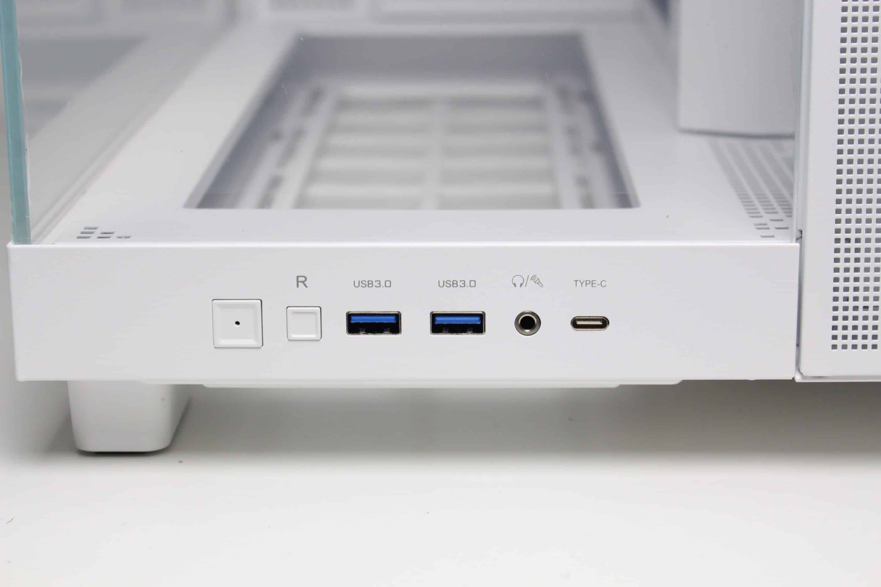 Äußerlich sieht das View 380 XL TG ARGB aus wie sein kleiner Bruder, nur einfach etwas größer. Optisch ist dieser Midi-Tower in die Kategorie der „Aquarium“-Gehäuse einzuordnen. So dominiert an der Front eine Scheibe aus ungetöntem Tempered Glass, welche ab Werk mit zwei Schutzfolien beklebt wurde. Darunter finden wir das I/O-Panel, welches über einen USB-C- und zwei USB-A-Ports verfügt. Außerdem bietet es eine 3,5-mm-Audiobuchse sowie zwei Taster für Power und Reset. Alle Anschlusskabel sind löblicherweise komplett weiß gehalten.