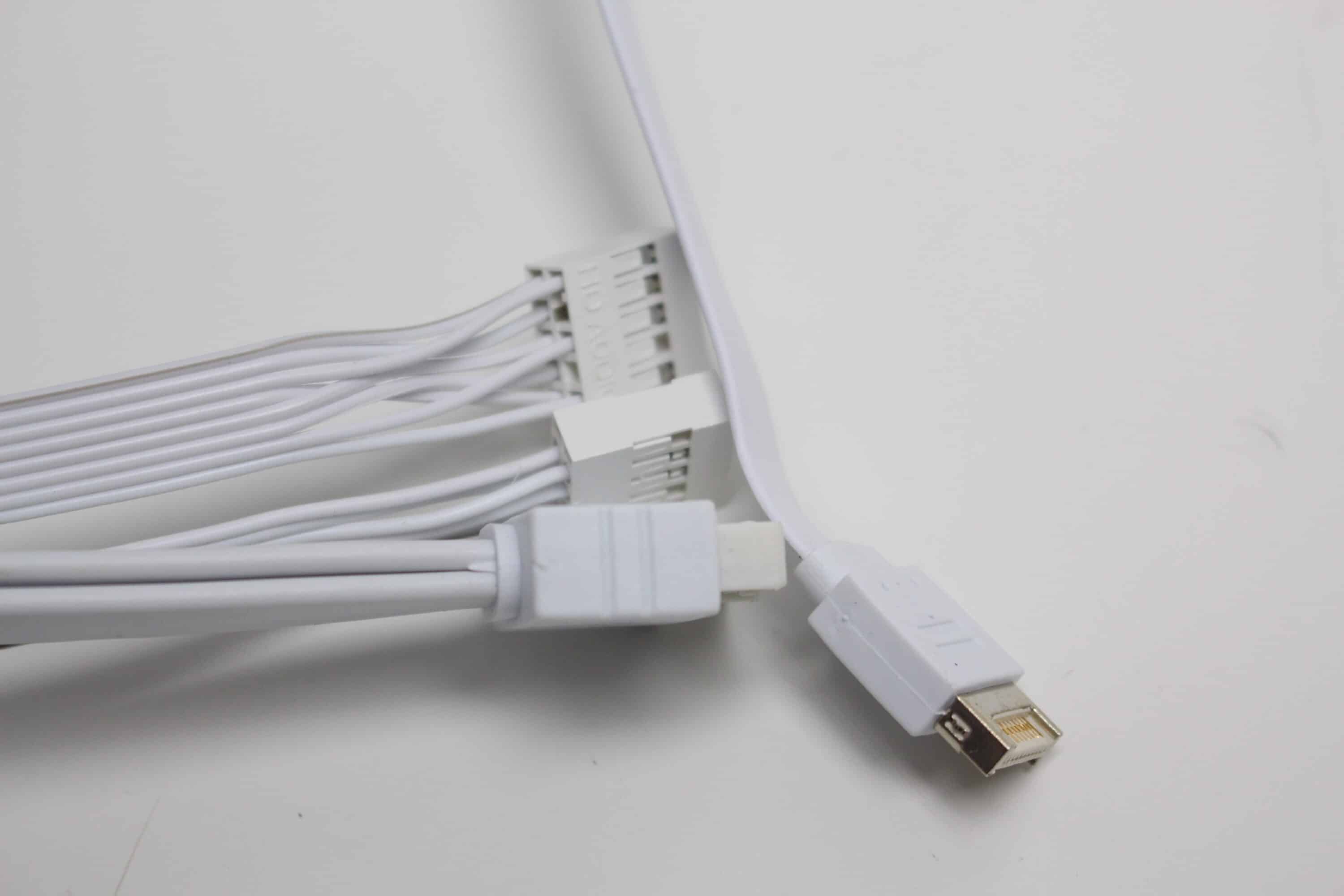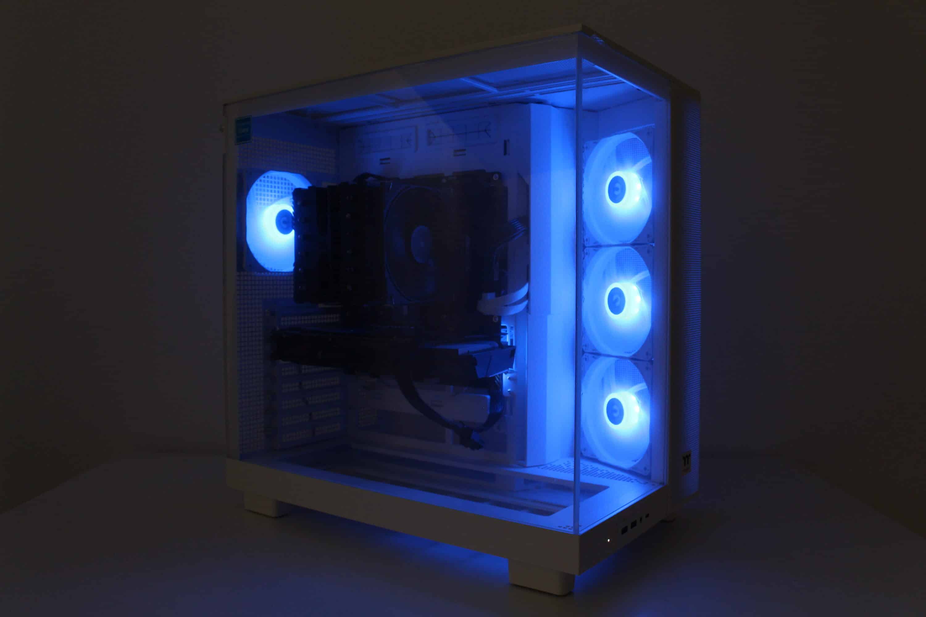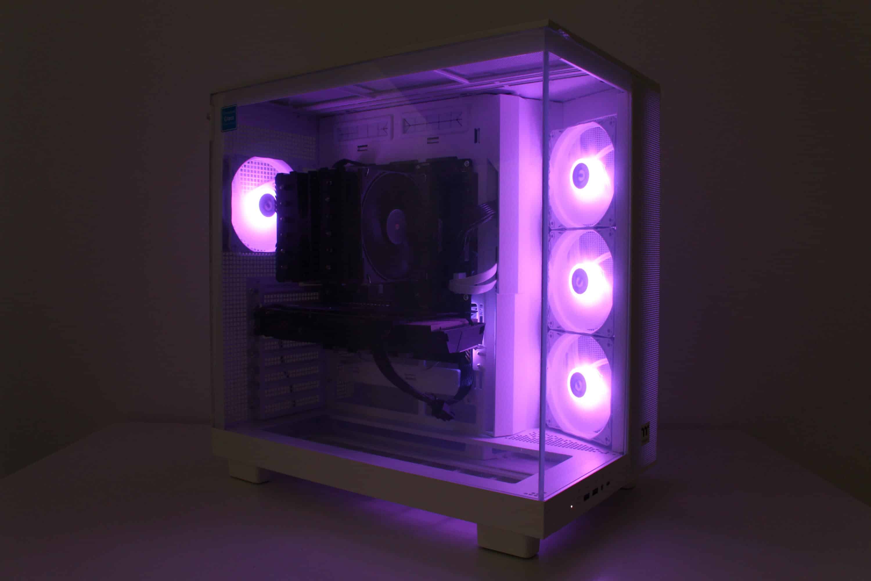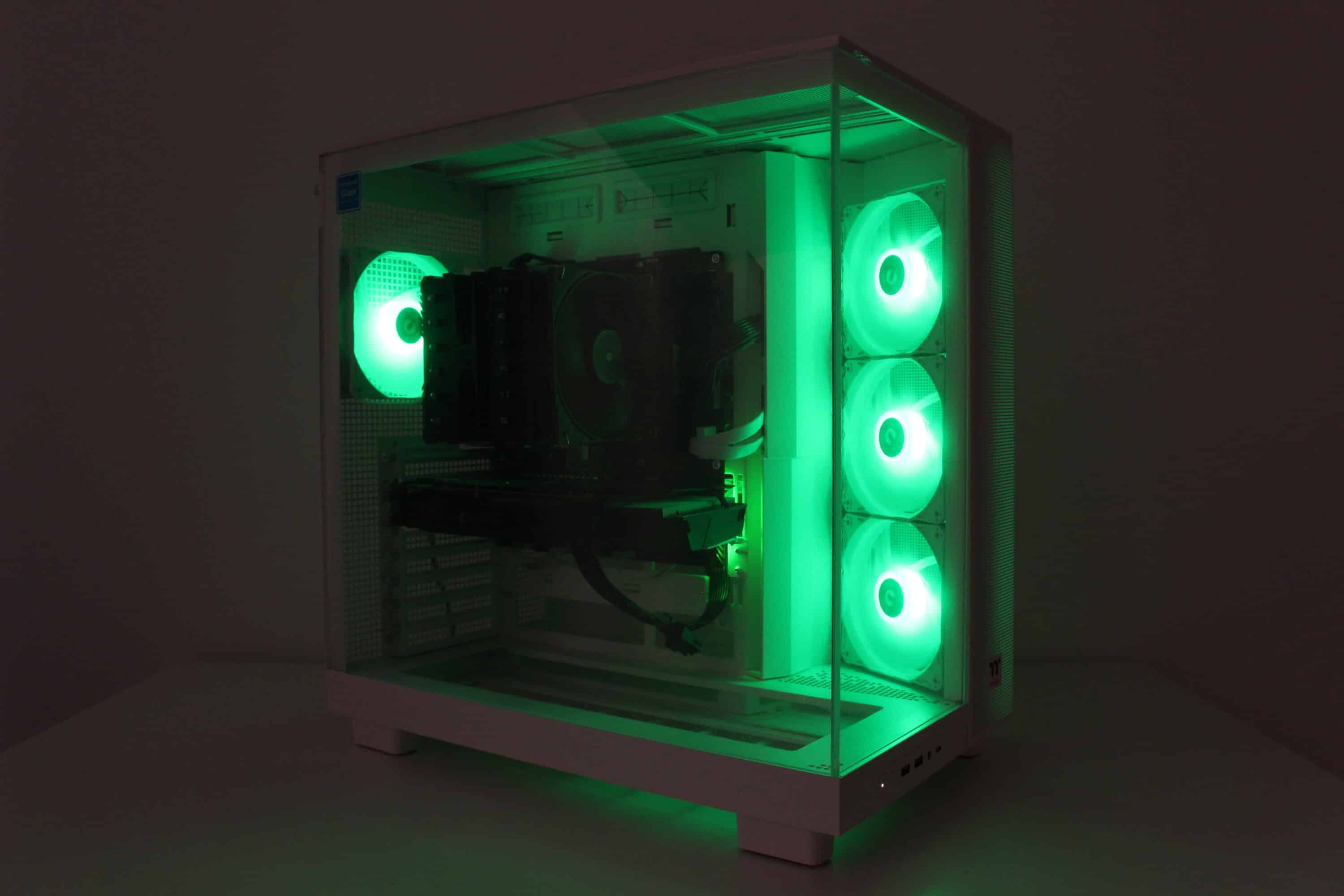 Ab Werk verfügt das Thermaltake View 380 XL TG ARGB über vier vorinstallierte Lüfter mit ARGB-Beleuchtung. Pro Lüfter konnten wir zehn LEDs ermitteln, die in der Lüfternabe verbaut wurden. Der Anschluss erfolgt dabei mittels Daisy-Chain-Verbindung am 3-Pin 5V ARGB-Header am Mainboard. Abschließend noch ein paar Impressionen der aktivierten Beleuchtung.