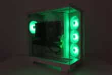 Die drei seitlichen Lüfter befördern aufgrund Ihrer Orientierung kalte Luft in den Innenraum und zudem kommt die Beleuchtung dadurch besser zur Geltung. Der Luftstrom wird mittels Kabelkanal leicht am Mainboard vorbeigeleitet und trifft genau auf die Grafikkarte. Außer der modularen GPU-Halterung im unteren Bereich befinden sich keine störenden Elemente im Luftstrom. Für den Abstransport der erwärmten Luft sorgt der vierte vorinstallierte 120-mm-Lüfter im Heck.