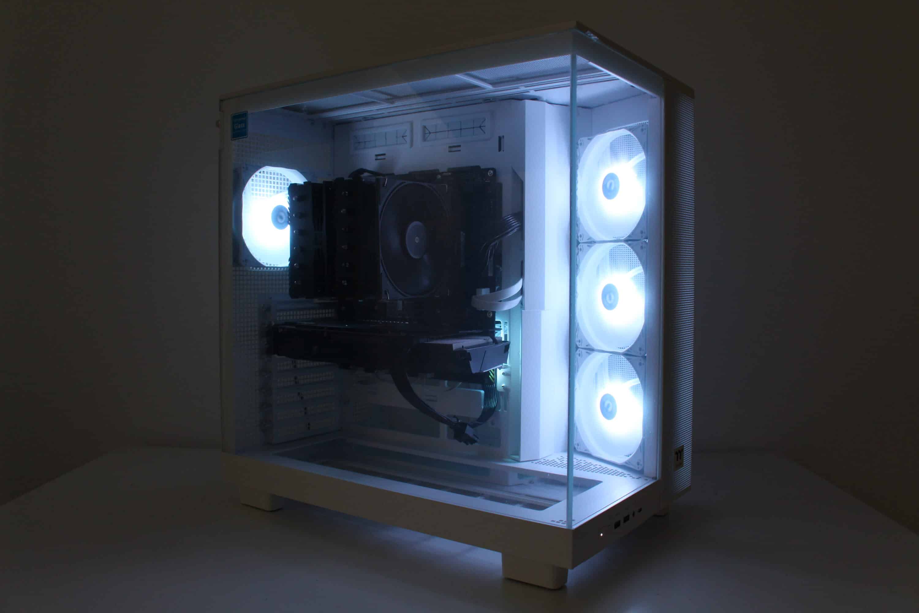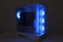 Die Gehäuselüfter sind auf niedriger und mittlerer Drehzahl kaum hörbar und agieren sehr dezent und keinesfalls störend. Bei voller Drehzahl ist ein gewisses Luftrauschen zu vernehmen, welches wir im Vergleich zu anderen Gehäuselüftern zwar als gut hörbar aber ebenfalls nicht als störend einordnen würden. Frei von Nebengeräuschen wie z.B. einem leisen Klackern sind aber auch diese Lüfter leider nicht.