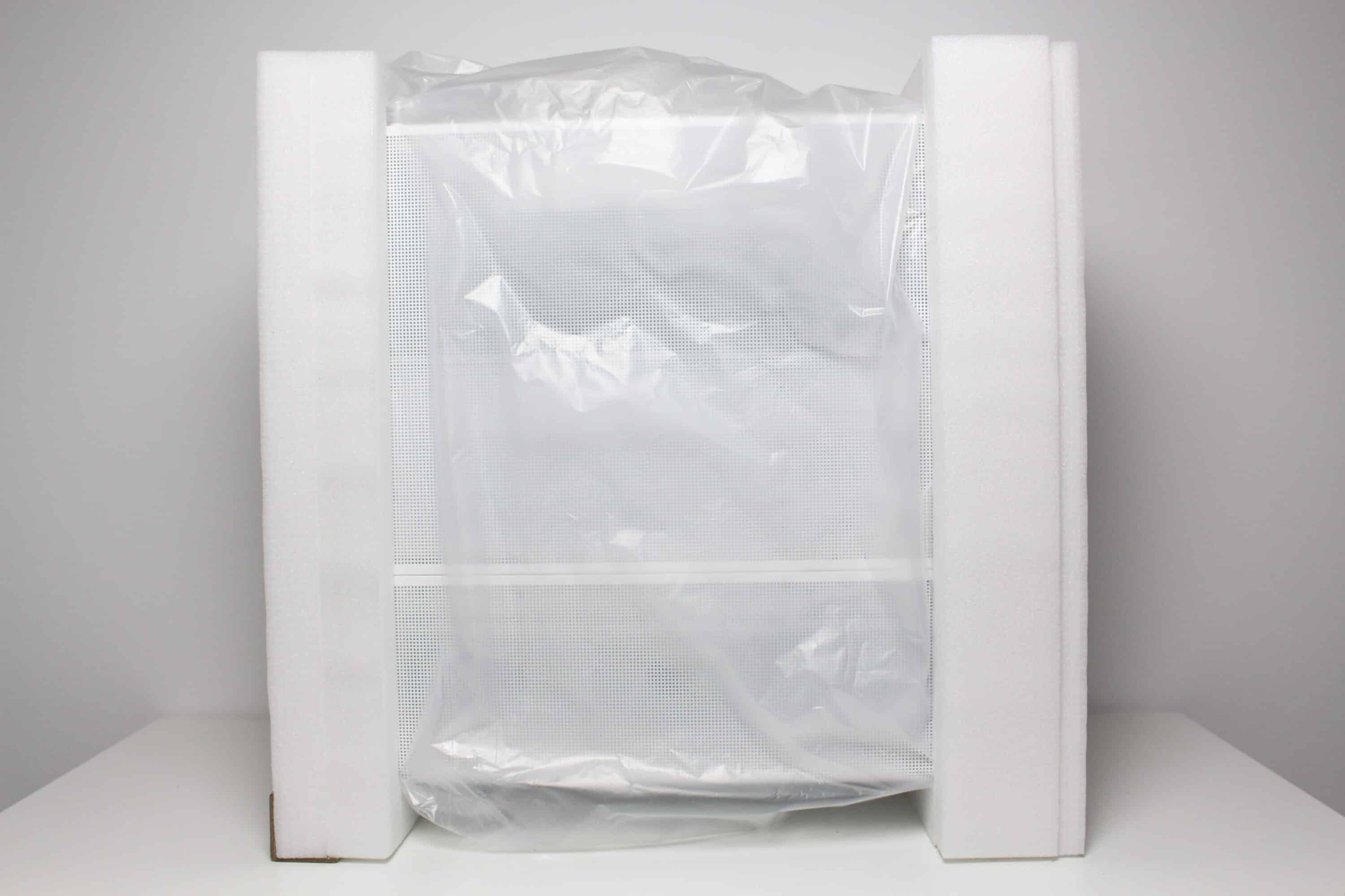 Im Inneren des Kartons umhüllt Thermaltake das Gehäuse mit zwei Blöcken aus weichem Schaumstoff sowie mit einer Folie aus Kunststoff. Zusätzlich wurde der Schaumstoff im Bereich der Front mit einem Streifen aus stabiler Pappe stabilisiert. Das Montagezubehör platziert Themaltake in einer braunen Schachtel, in der dann wiederum eine praktische Zubehörbox zu finden ist. Diese beinhaltet alle notwendigen Schrauben, Klettstreifen, weiße Kabelbinder, einen Mainboard-Speaker sowie eine GPU-Halterung.