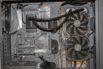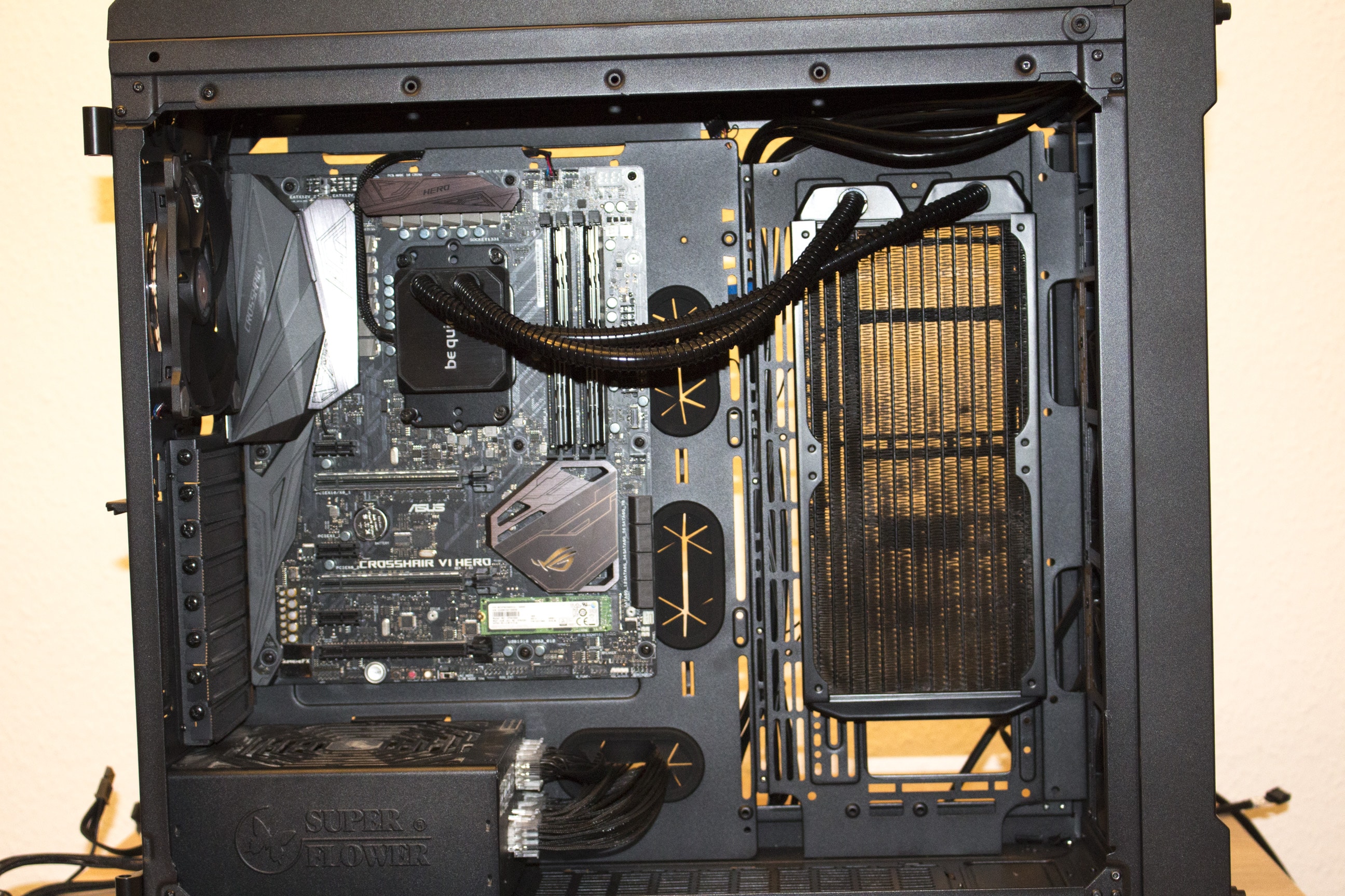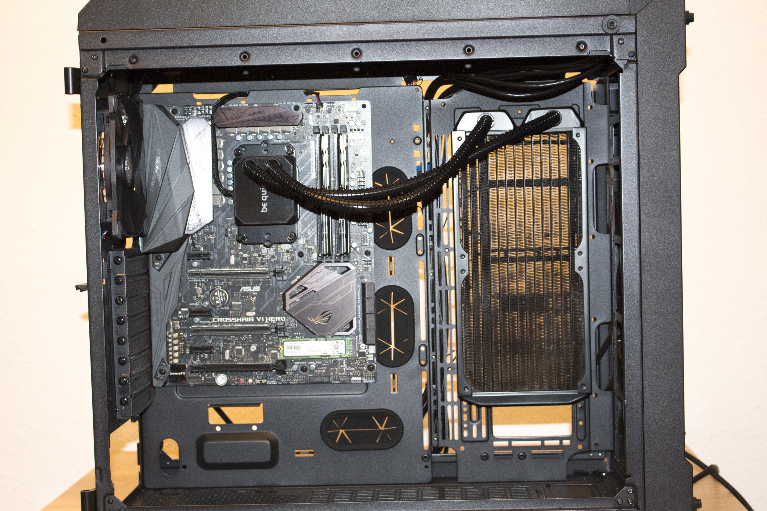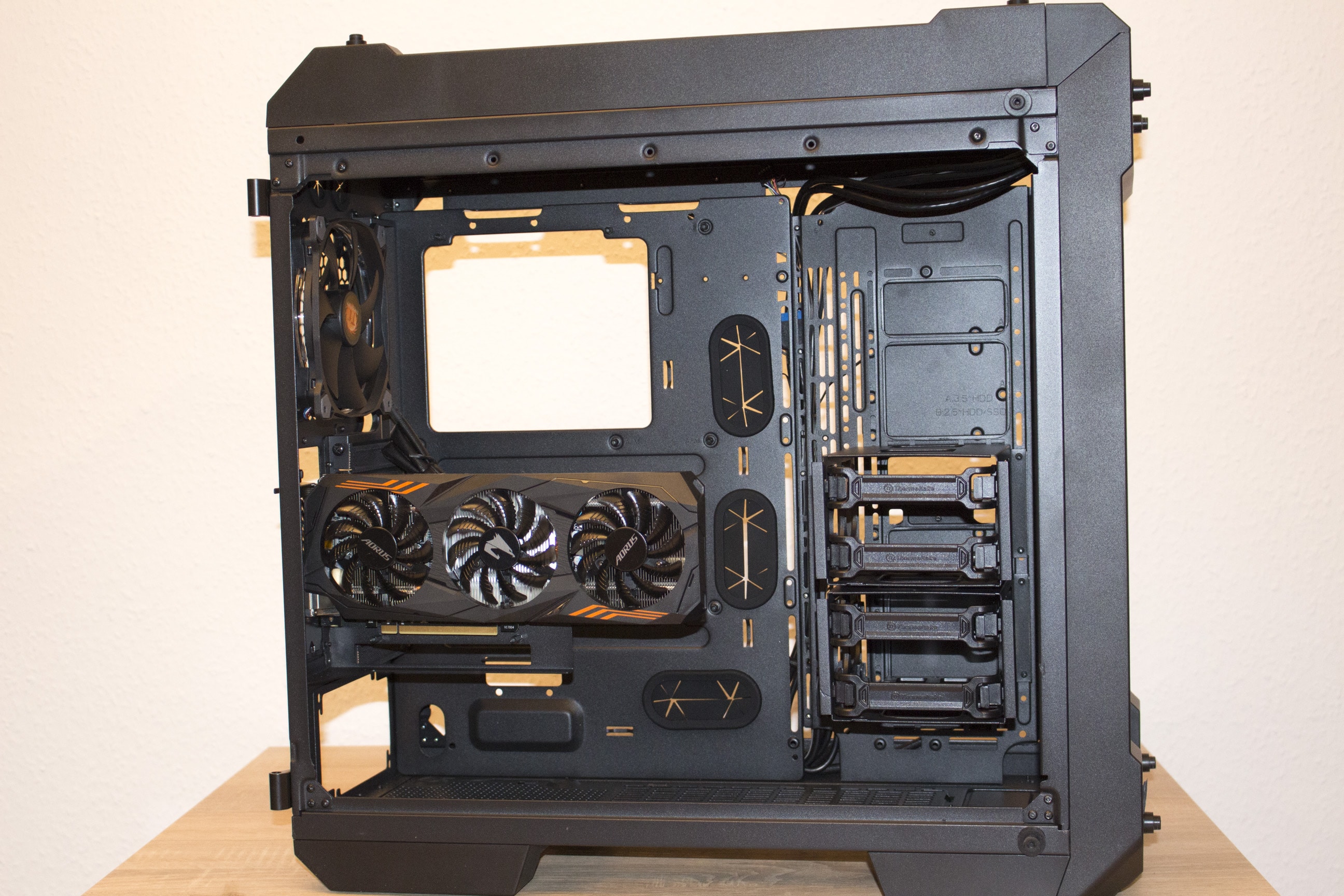 Als erstes habe ich alle Glaselemente abgenommen, um das Gewicht des Towers zu reduzieren. Die Glasplatten an Front und Boden werden mit je vier Thumbscrews gehalten, die man lösen muss, um diese entfernen zu können. Die beiden Seitenteile sind quasi Türen mit Scharnieren, die ausgehakt werden können, sobald man die zwei Schrauben entfernt hat. Dann fix die Gigabyte GeForce GTX 1060 Aorus 6G in die vertikale Halterung gesetzt, um diese zu demonstrieren. Beim Entfernen der Halterung musste ich dann viel Geduld und WD40 einsetzen, da Thermaltake eine der Schrauben sehr fest angezogen hat. Dann fix die Festplattenkäfige entfernt und in den Mülleimer geworfen, die SSD/HDD-Halterungen rechts neben dem Mainboard entfernt und rein mit der Hardware. Die AiO-Wasserkühlung habe ich aus meinem „alten“ Gehäuse zusammen mit dem Mainboard im Thermaltake View 71 TG RGB eingesetzt und anschließend das Netzteil eingebaut.