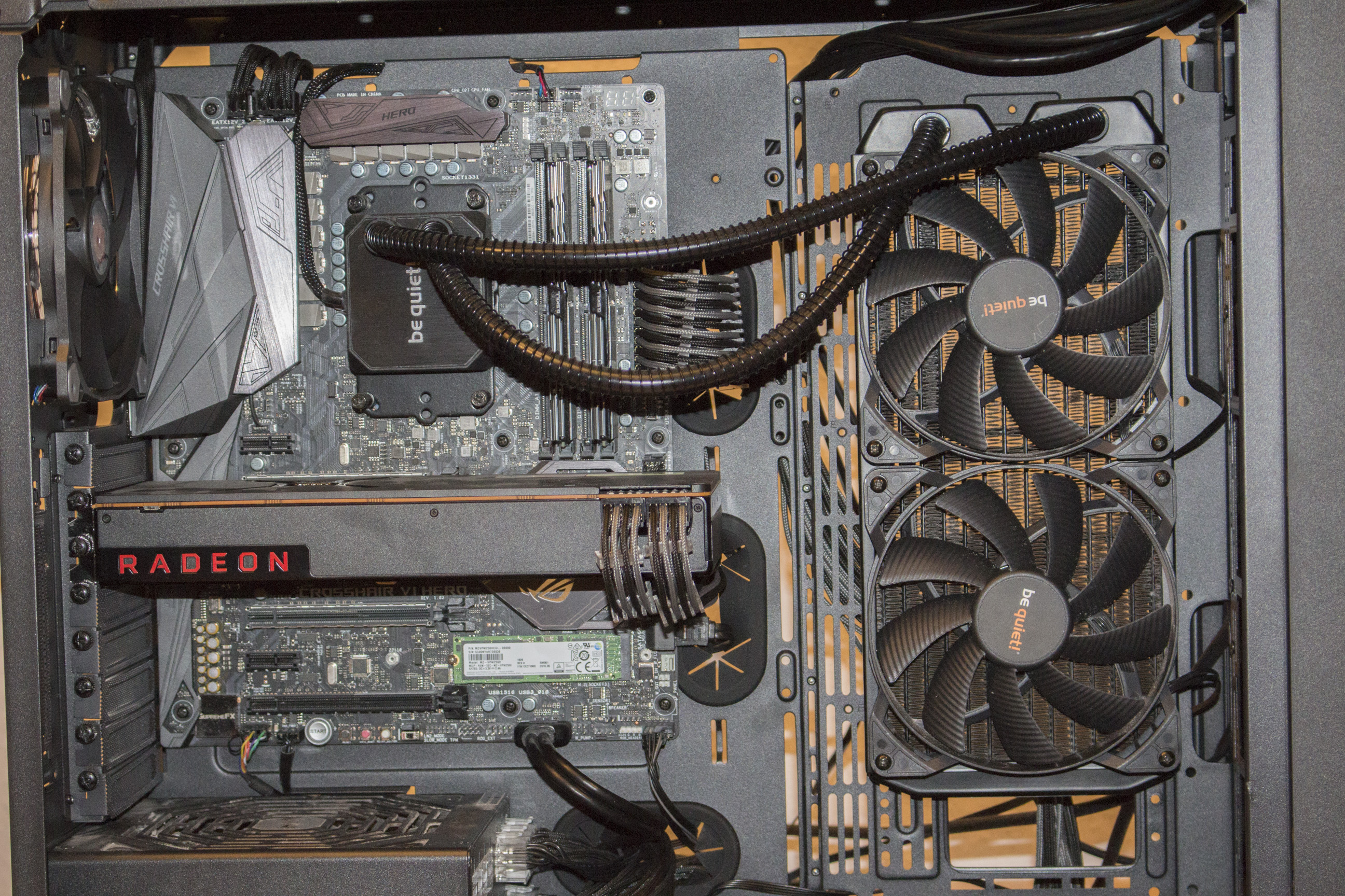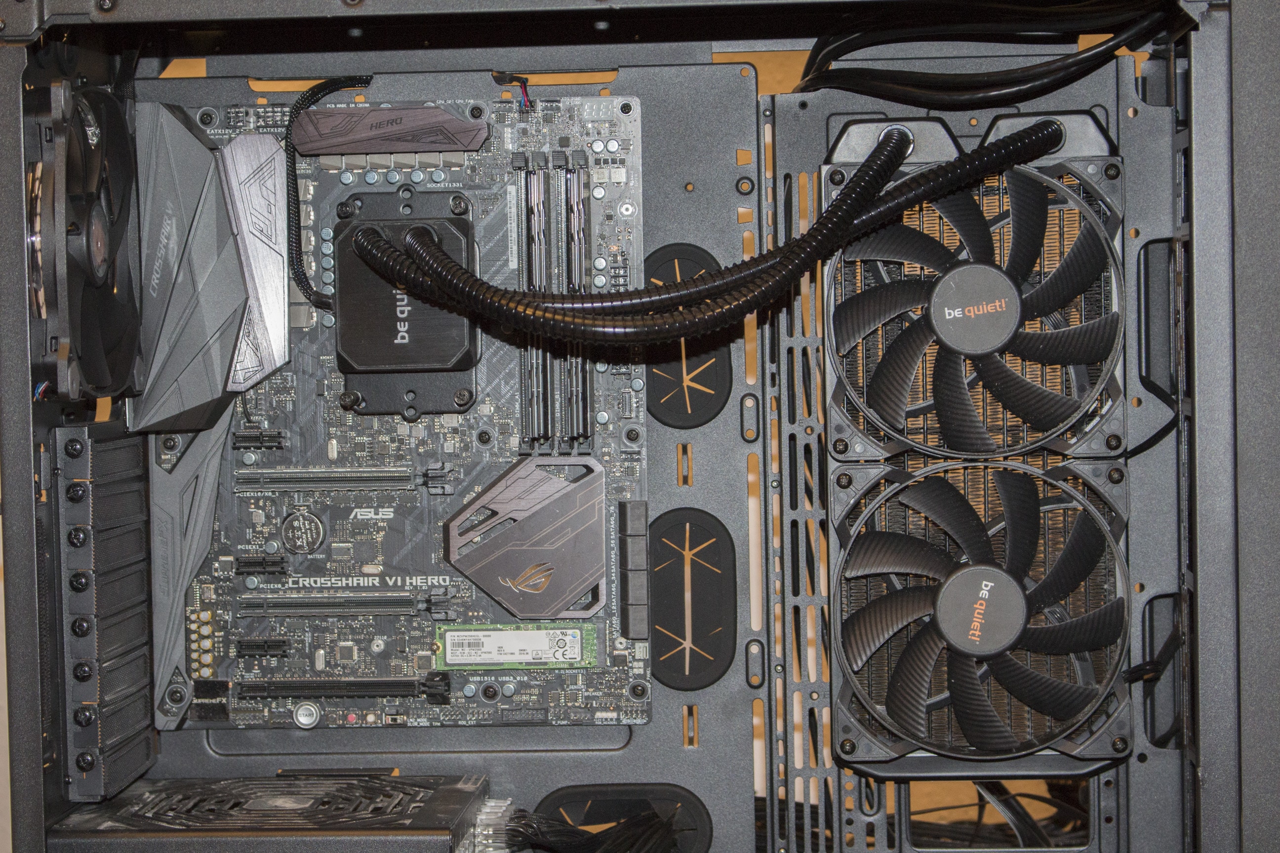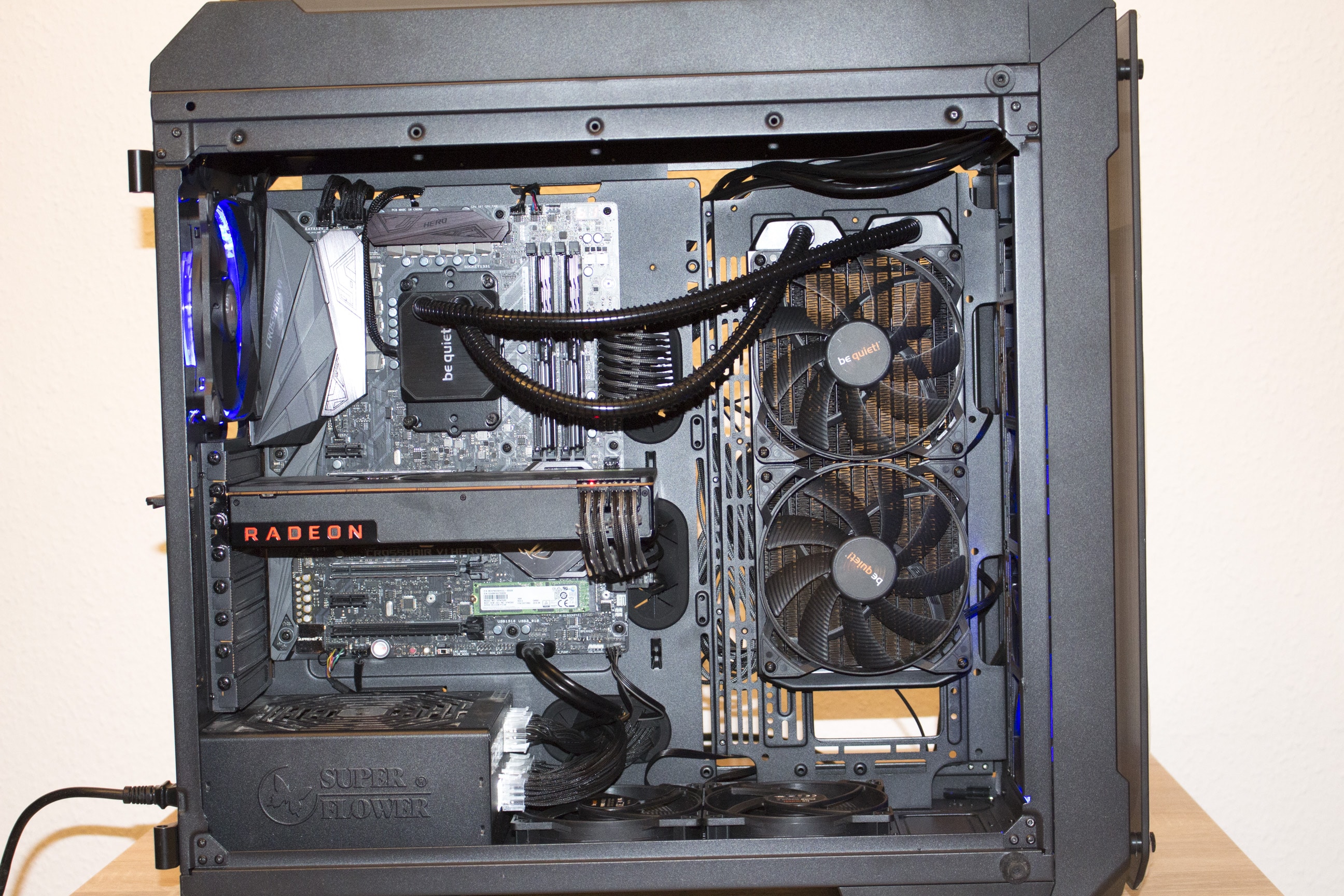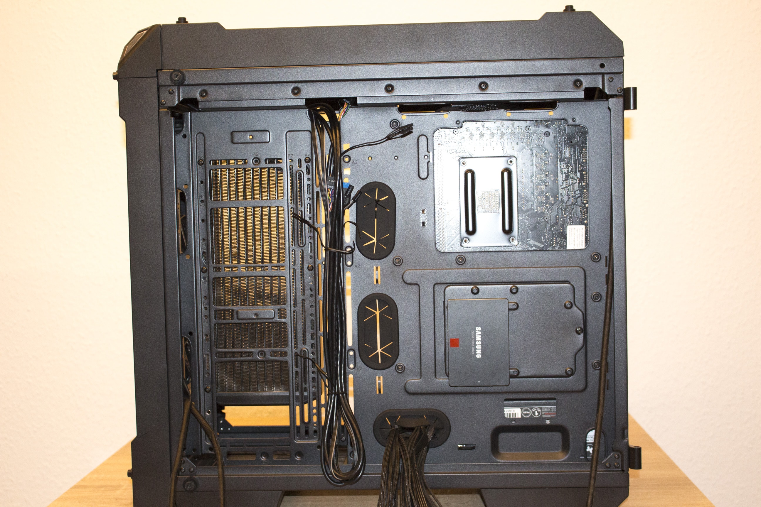Zum Einbauen der SSD auf der Rückseite muss man die Halterung abnehmen, indem man die Thumbscrew löst. Die Halterung nimmt zwei SSDs oder eine HDD auf. Im nächsten Schritt habe ich die Lüfter der AiO-Wasserkühlung so montiert, dass die „Luft“ gegen die Scheibe an der rechten Seite geblasen wird, von wo sie dann durch die großzügigen Abstände zum Chassis entweichen kann. Die Lüfter im Boden saugen Luft in das Innere des Thermaltake View 71 TG RGB Full-Towers und tragen zur Kühlung bei, indem sie sowohl der Grafikkarte als auch dem Radiator kühle Luft zuführen. Was ich vermisst habe, waren gut zugängliche Öffnungen, um die Anschlüsse an der unteren Kante des Mainboards anzustecken. Wer andere Reviews von mir gesehen hat, wird sich an dieser Stelle zudem über das ungewohnt „saubere“ Kabelmanagement wundern.