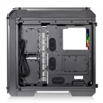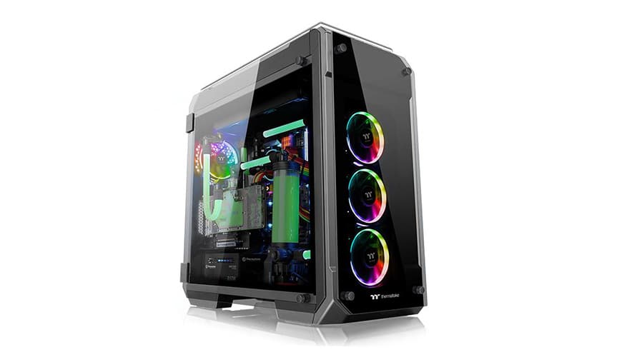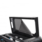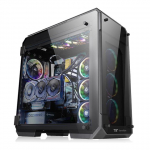 Das Thermaltake View 71 TG RGB ist ein Hybrid aus Show-Case und Big-Tower. Während die Form an einen normalen, überdimensionierten Tower erinnert, bietet das View 71 Elemente, die von den Wandgehäusen der Core-Serie ausgeliehen wurden: einen seitlich montierbaren Radiator neben dem Mainboard. Wird hier zum Beispiel eine Water 3.0 Riing RGB oder eine Floe Riing RGB TT Premium-Edition Komplett-Wasserkühlung montiert, verwandelt sich der Full-Tower in ein farbenfrohes Show-Case. Wie bei den Gehäusen der View-Serie kann zudem auch die Grafikkarte vertikal montiert werden.