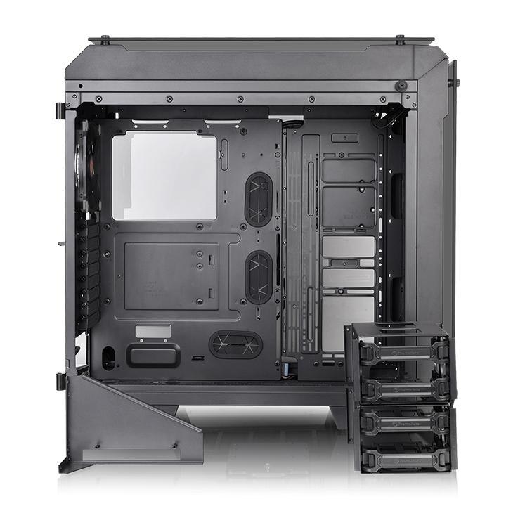 Das Interieur ist modular gestaltet, so dass das Thermaltake View 71 für ein großes Spektrum an Anforderungen genutzt werden kann. Bis zu zehn SSDs oder sieben HDDs können installiert werden. Mehrere große Radiatoren können für eine Custom-Loop-Wasserkühlung installiert werden. Bis zu neun Lüfter ermöglichen einen guten Airflow. Es ist schön zu sehen, dass Thermaltake ein schickes Äußeres mit besonders hoher Funktionalität kombiniert hat. Top!