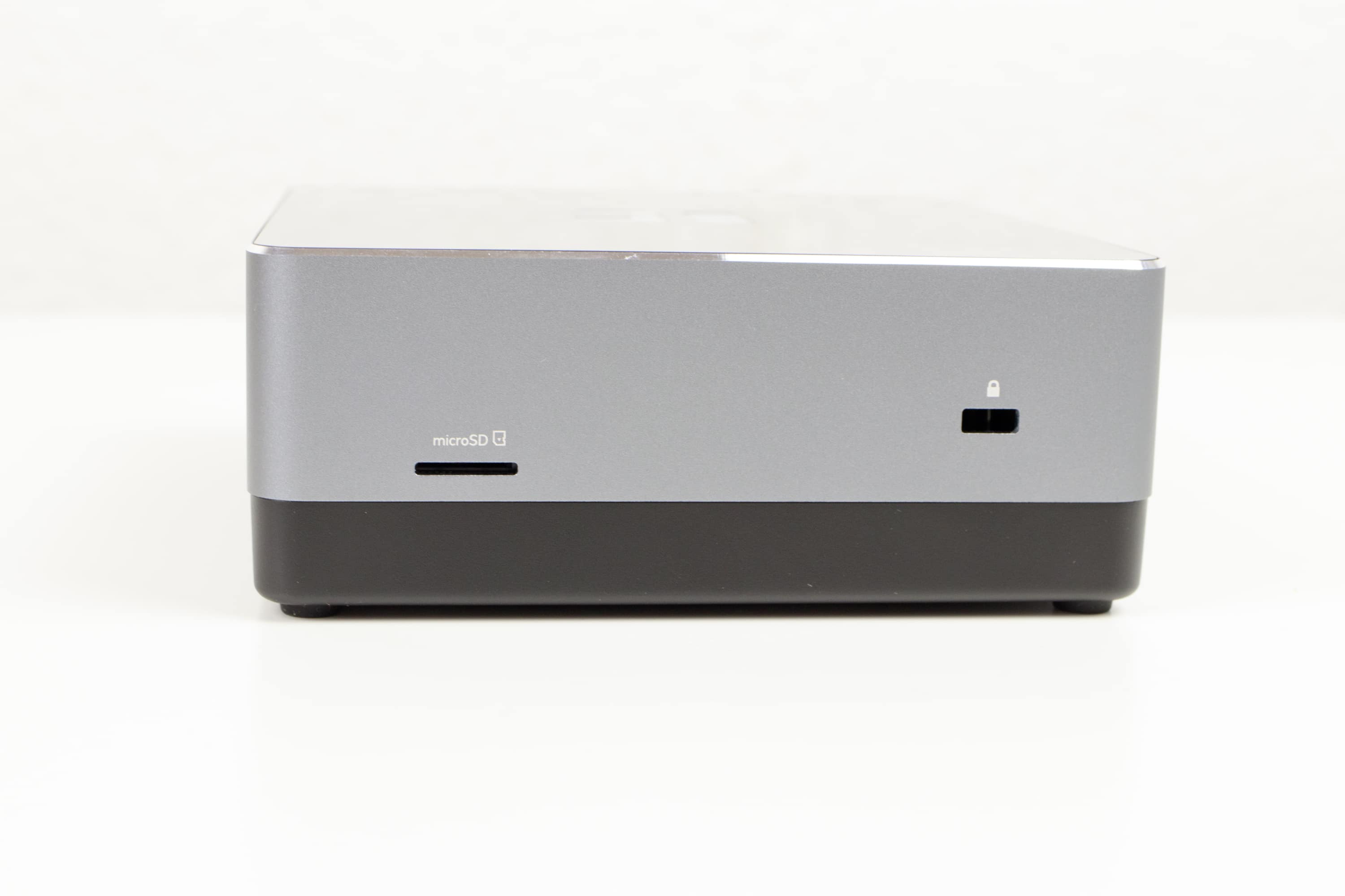 Seine größte Stärke liegt jedoch in einem anderen Bereich: Er bietet trotz der geringen Größe angenehm viele Anschlussmöglichkeiten. Zwei HDMI-Anschlüsse, zwei USB-A-2.0-Anschlüsse, zwei USB-A-3.1-Anschlüsse, ein USB-C-3.1-Anschluss, Audioeingang und -ausgang, Speicherkartenleser und ein M.2-Steckplatz zeichnen das Gerät nicht nur aus, sondern machen es auch enorm flexibel.
