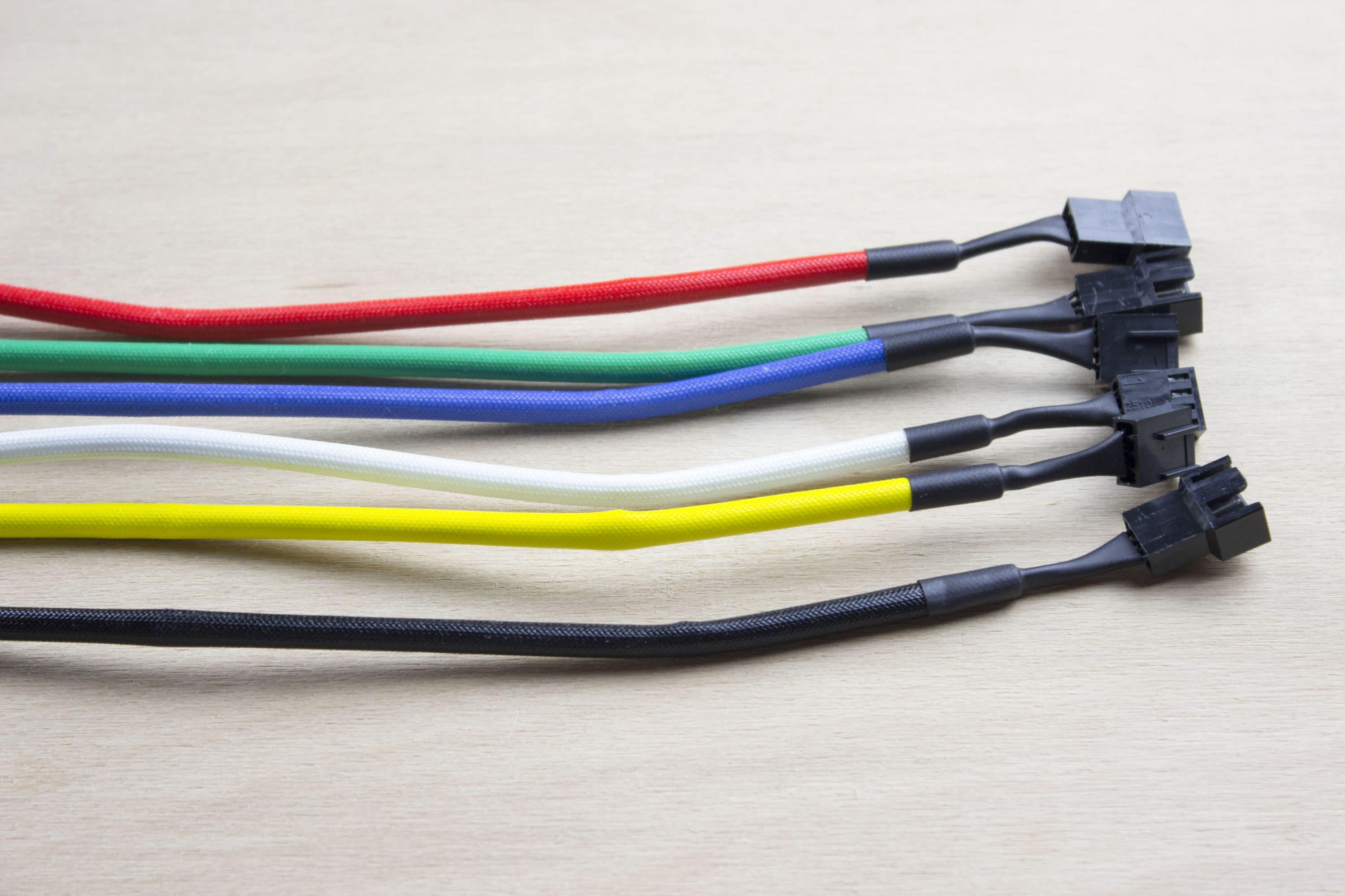 Bei den NA-SEC1 handelt es sich um Verlängerungen für Lüfterkabel. Über das 30 cm lange Kabel können Lüfter mit 4-Pin-Anschluss mit Strom versorgt werden. Natürlich könnt ihr ebenso 3-Pin-Lüfter mit dem Kabel verbinden. Wie für Noctua üblich wird kein Kunststoffgewebe für das Kabel verwendet, sondern ein gummierter Schrumpfschlauch. Die Beschichtung der Kabel wirkt sich aber nicht nur positiv aus. Es ist nicht unbedingt leicht einen Bogen mit den Kabel zu ziehen, da sie direkt abknicken. Ansonsten machen die Kabel einen sehr soliden Eindruck, die Farben sind sehr kräftig und fallen direkt auf.