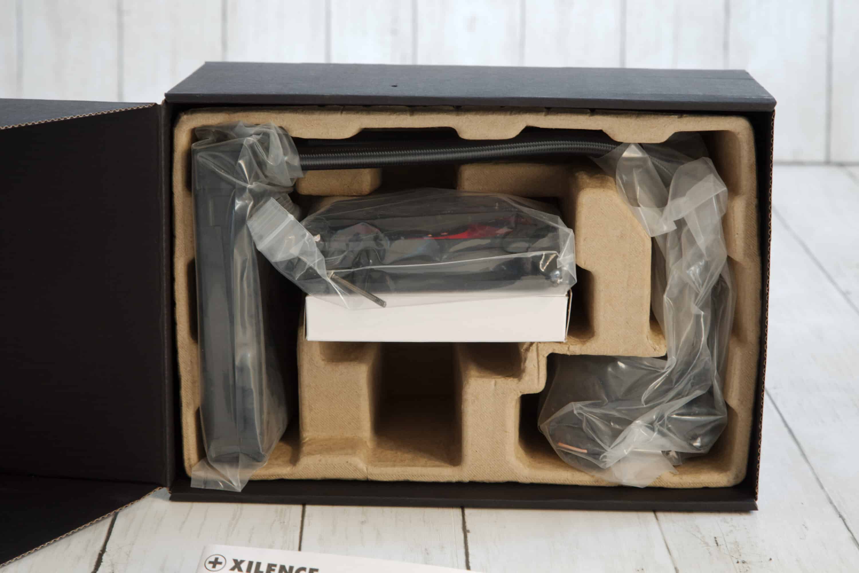Die Verpackung des Xilence LiQuRizer LQ120 ist im typischen Xilence-Stil in glattem Schwarz-Weiß gehalten mit dem Produktaufdruck im Zeichentrick-Stil und schwarzen und roten Akzenten. Darin findet sich ein Karton, der die Einzelteile hält, welche wiederum in Kunststoff verpackt sind. Der Lüfter ist einzeln verpackt und nicht vormontiert. Das Montagematerial steckt in einer weiteren Papp-Box.
