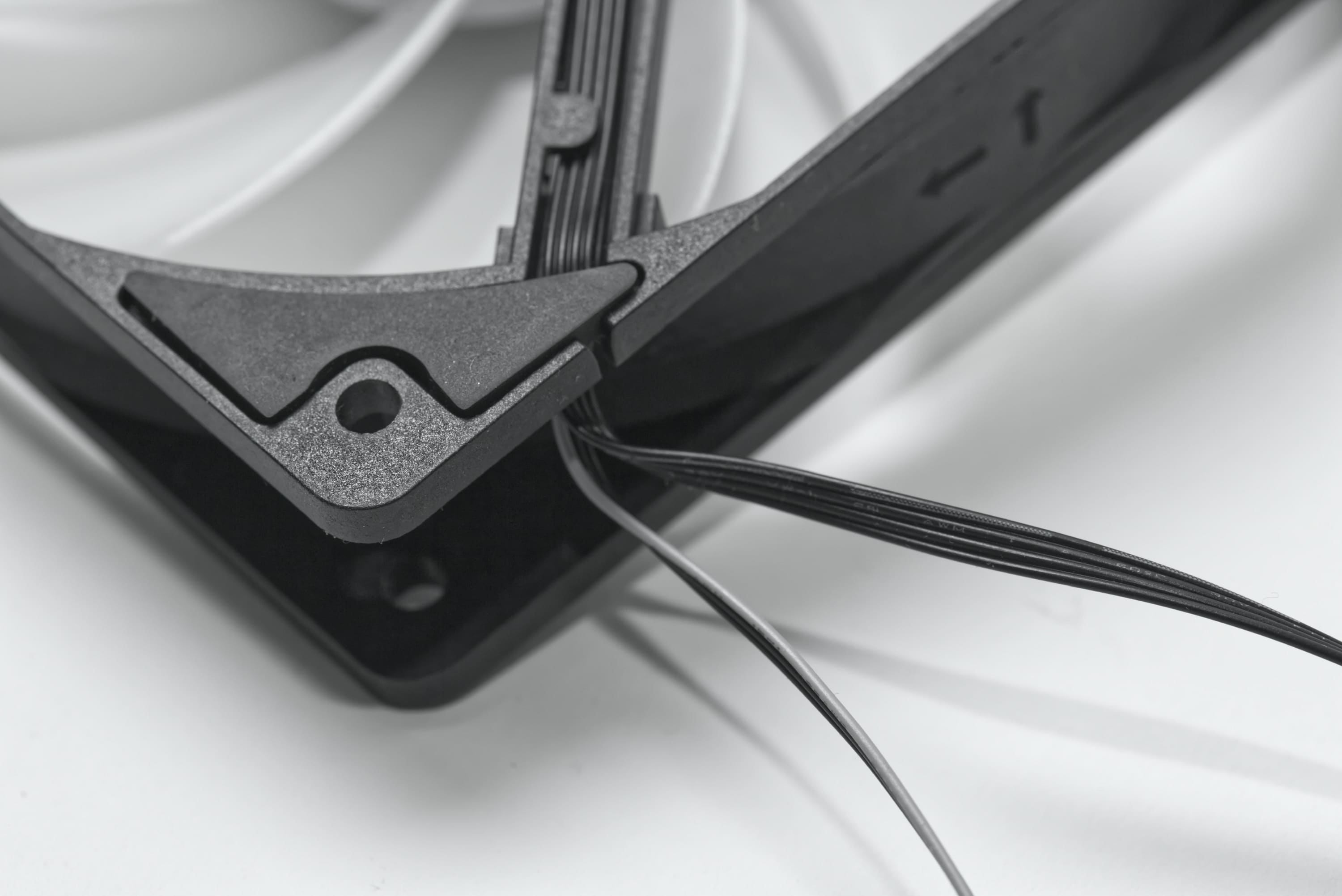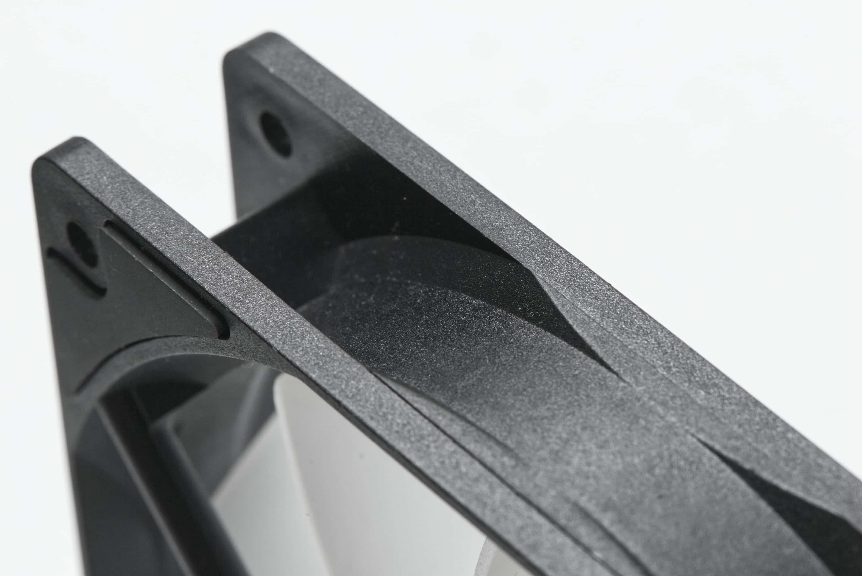 Dazu halten die Lüfterblätter einen ziemlich großen Abstand zum Rahmen, was Probleme durch Verschleiß oder Fertigungstoleranzen verringert, aber ein wenig Leistung kosten wird. Das liegt daran, dass aufgebauter Druck an den Seiten entweichen könnte oder schlicht und einfach weniger Fläche da ist, um Druck zu erzeugen.
