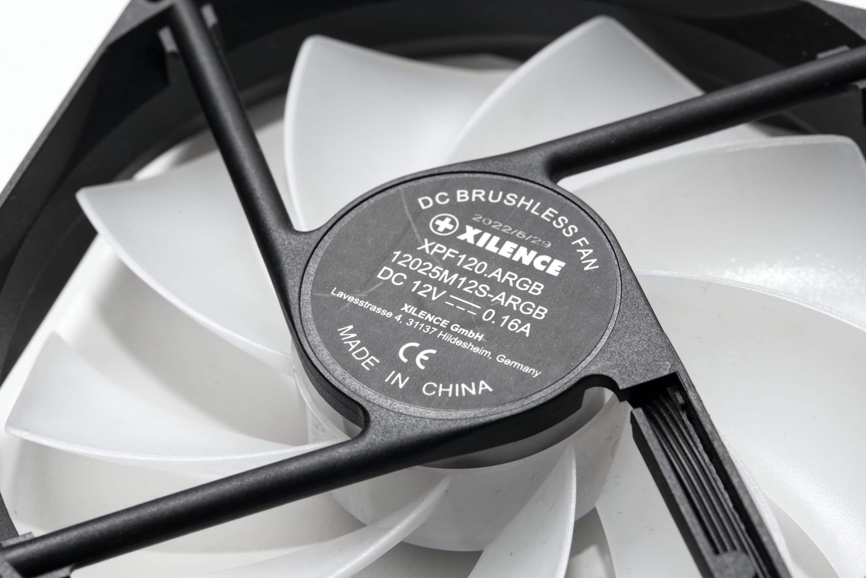 Joa, die Verarbeitung des Xilence XPF120.ARGB wirkt unspektakulär. Der Rahmen wirkt generisch und weist nahezu keine Besonderheiten vor. Einzig die Gummi-Auflageflächen geben dem Rahmen einen Hauch vorn Wertigkeit. Dazu muss man sagen, dass der Rahmen einigermaßen verwindungssteif ist – noch ein Pluspunkt. Die Lüfterblätter wirken von der Verarbeitung her ebenfalls sauber und haben keinerlei unsaubere Kanten oder Grate. Dafür sitzt an den Xilence XPF120.ARGB im Test das Logo in der Lüftermitte nicht komplett mittig, sondern wobbelt etwas herum, wenn man den Lüfter dreht.
