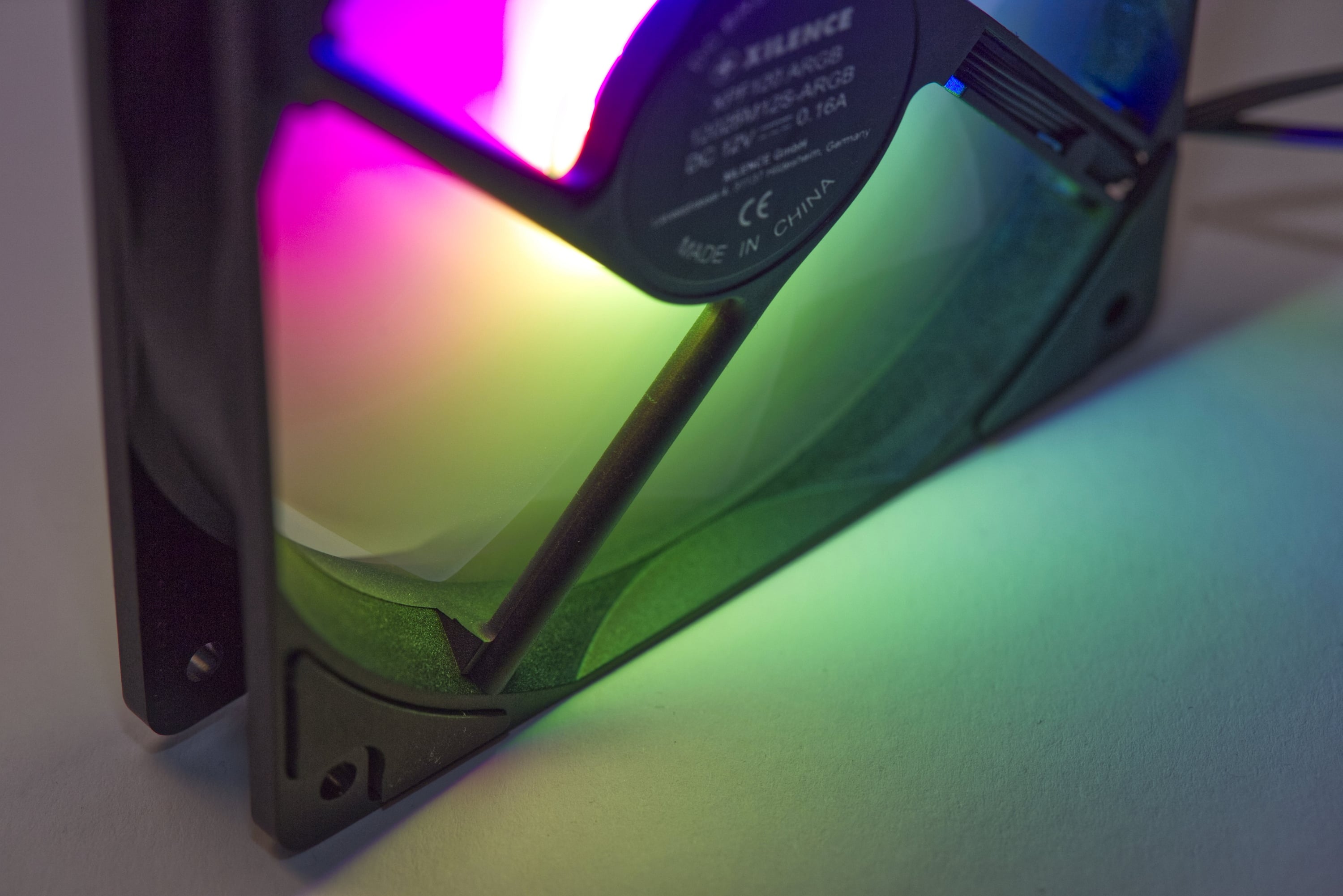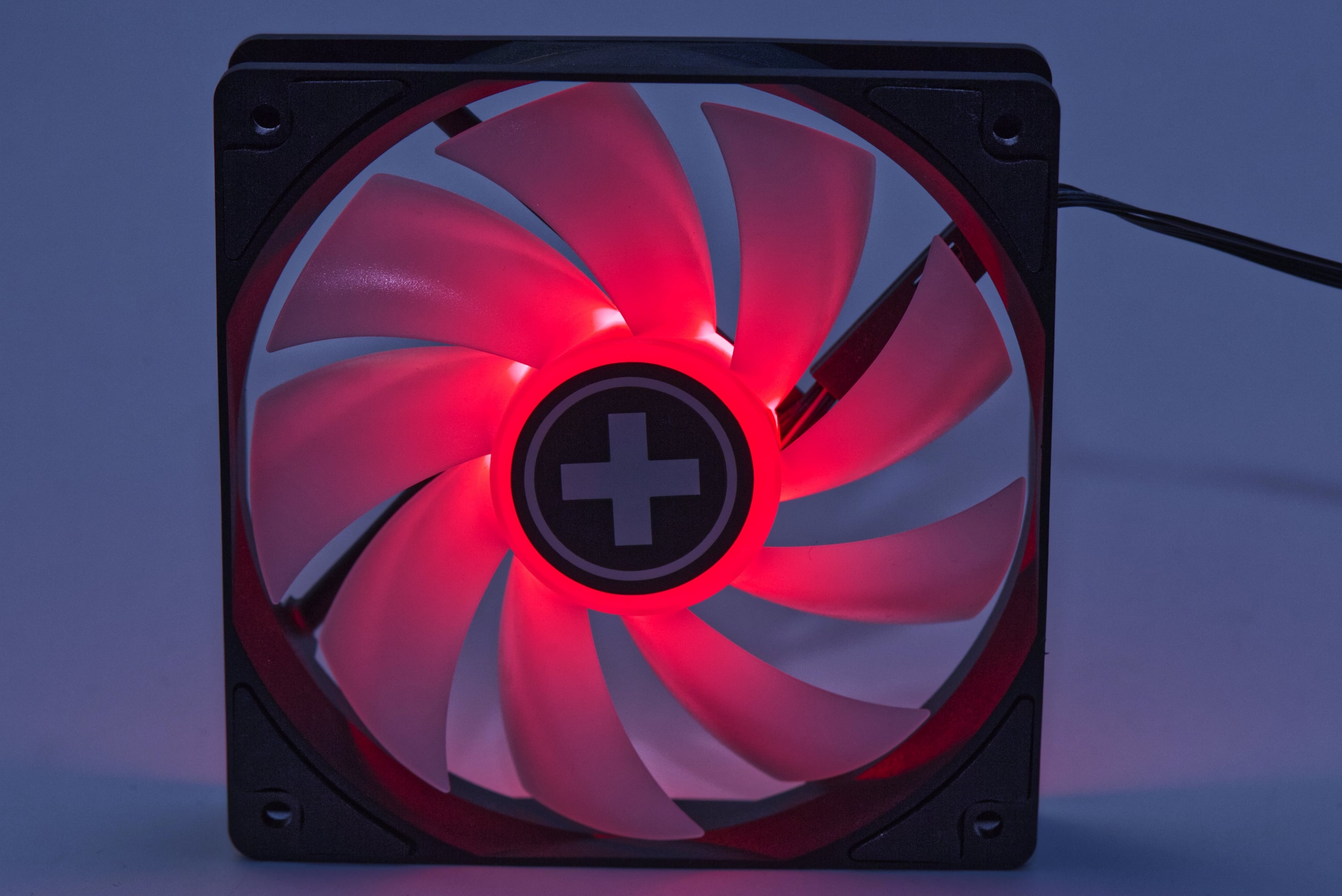 Positiv gesehen: Die LEDs leuchten nicht nervig zu den Seiten heraus – auch nicht aus dem kritischen Blickwinkel von schräg hinten. Hiermit haben auch deutlich teurere Lüfter, beispielsweise die Noiseblocker NB-eLoop X, mehr Probleme.