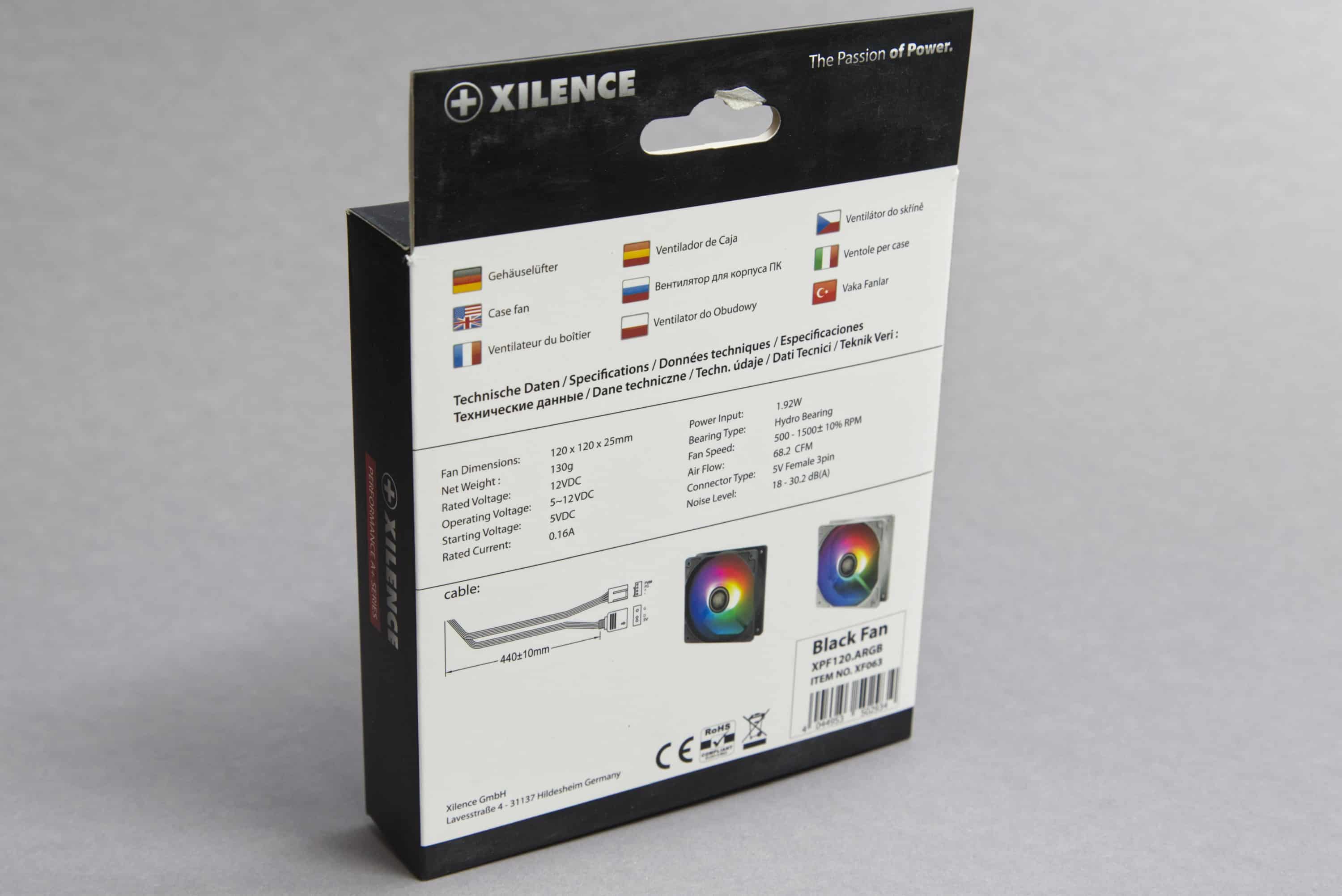 Die Verpackung der Xilence XPF120.ARGB ist durchaus sauber gestaltet und nicht allzu überladen. Ein schwarzer Rahmen mit einer weißen Fläche für die Beschriftung bilden das Grundgerüst für das Verpackungsdesign. Auf der Vorderseite ist der Lüfter im Zeichenstil angedeutet und auf der Rückseite sind die Spezifikationen zusammengefasst.