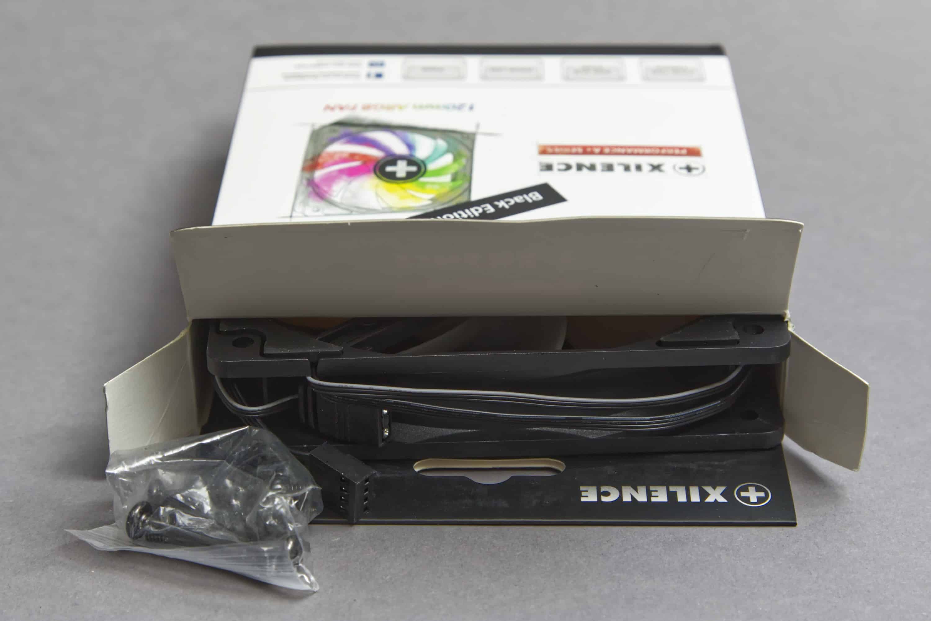 Letztendlich ist diese Schachtel sehr kompakt gehalten und ungepolstert, sodass der Lüfter unter Umständen etwas klemmt beim Herausziehen. Abgesehen von diesem findet sich noch eine Tüte mit Lüfterschrauben im Lieferumfang. Interessanterweise finden sich hier nicht nur die üblichen Gehäuselüfterschrauben. Auch schwarzverchromte Radiatorschrauben liegen bei, die auch bei manchen Gehäusen in der Front eingesetzt werden können.