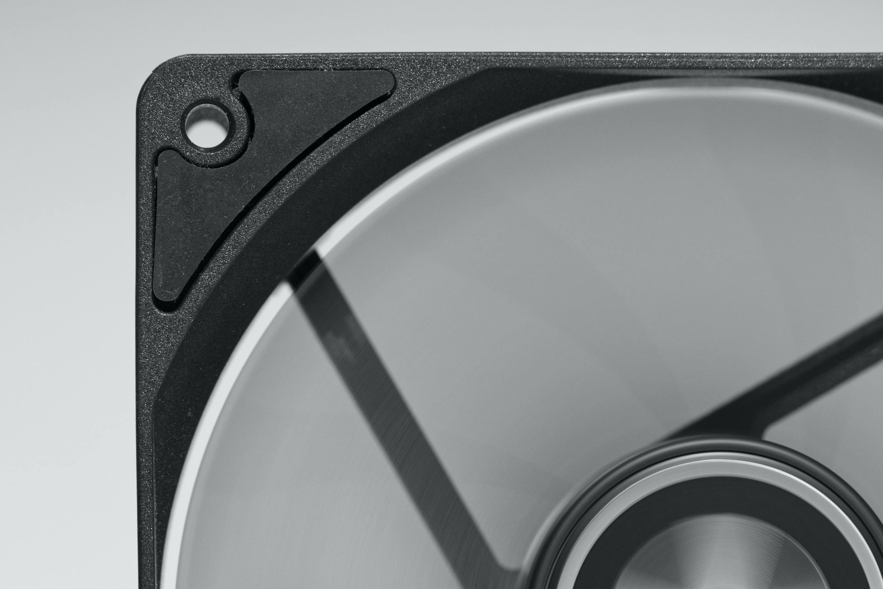Der Xilence XPF120X.B.PWM stammt aus der Reihe „Performance X“. Das ist die höchste Klasse von Xilence, oberhalb von Performance C als Unterklasse und Performance A+ als Mittelklasse. Wo die unteren Klassen oft mit roten Lüfterblättern kommen, ist das einzige, das am Xilence XPF120X.B.PWM direkt an das Erscheinungsbild der Marke erinnert, das Kreuz in der Mitte zwischen den Lüfterblättern. Dieses sticht optisch durch den metallischen Glanz auch heraus und gibt durchaus einen haptisch hochwertigen Charakter. Davon abgesehen wirkt der Lüfterahmen weitestgehend simpel. Was jedoch zu finden ist, das sind gummierte Auflageflächen, die in dieser Preisklasse tatsächlich noch eher selten sind.