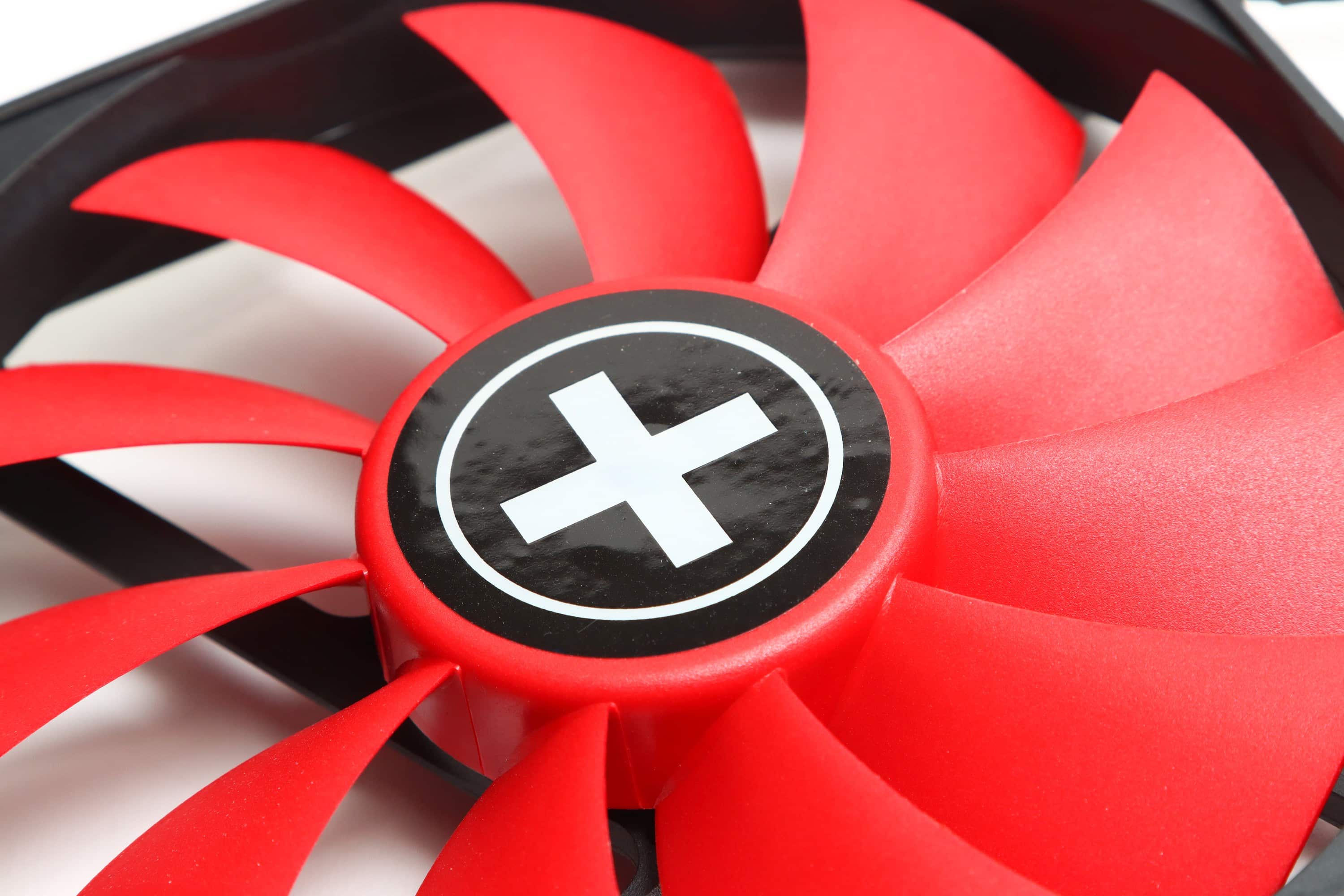 Die Lüfterblätter wirken etwas besser verarbeitet, halten aber einen recht großen Abstand zum Rahmen, wodurch vermutlich auch etwas Performance auf der Strecke gelassen wird. In der Mitte findet sich ein Aufkleber mit einem weißen Kreuz. Dieser wirkt auch nicht sonderlich hochwertig, was aber nicht zu sehen ist, wenn er sich dreht. Immerhin ist er bei meinen Testlüftern ziemlich zentriert.