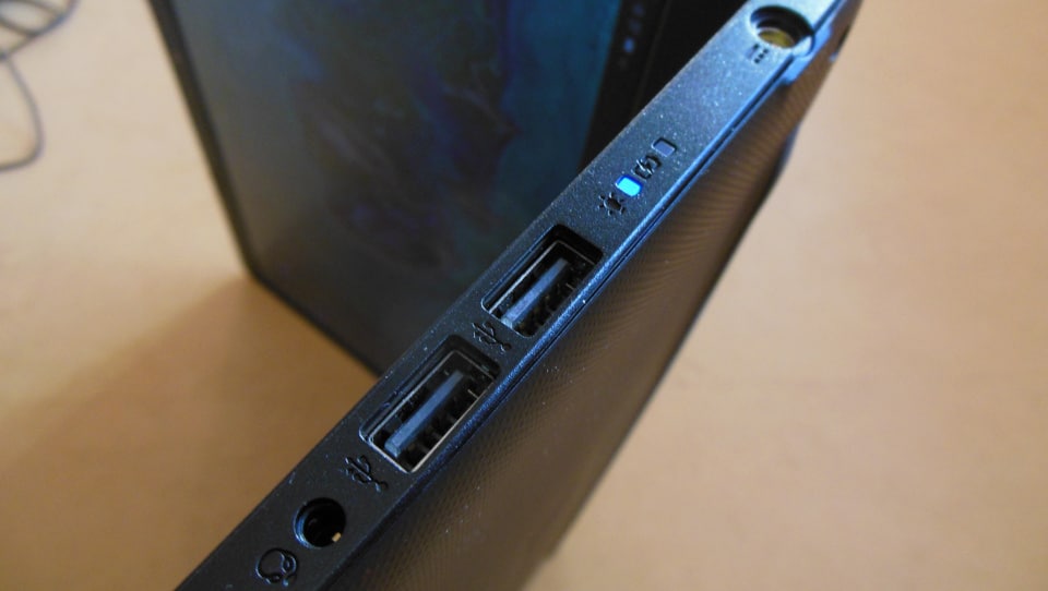 Die rechte Seite bietet einen Rundstecker-Anschluss für das Ladegerät, zwei USB-A-Ports sowie einen Kombo-Jack an. An diesem können entweder ein Headset oder Kopfhörer eingesteckt werden.