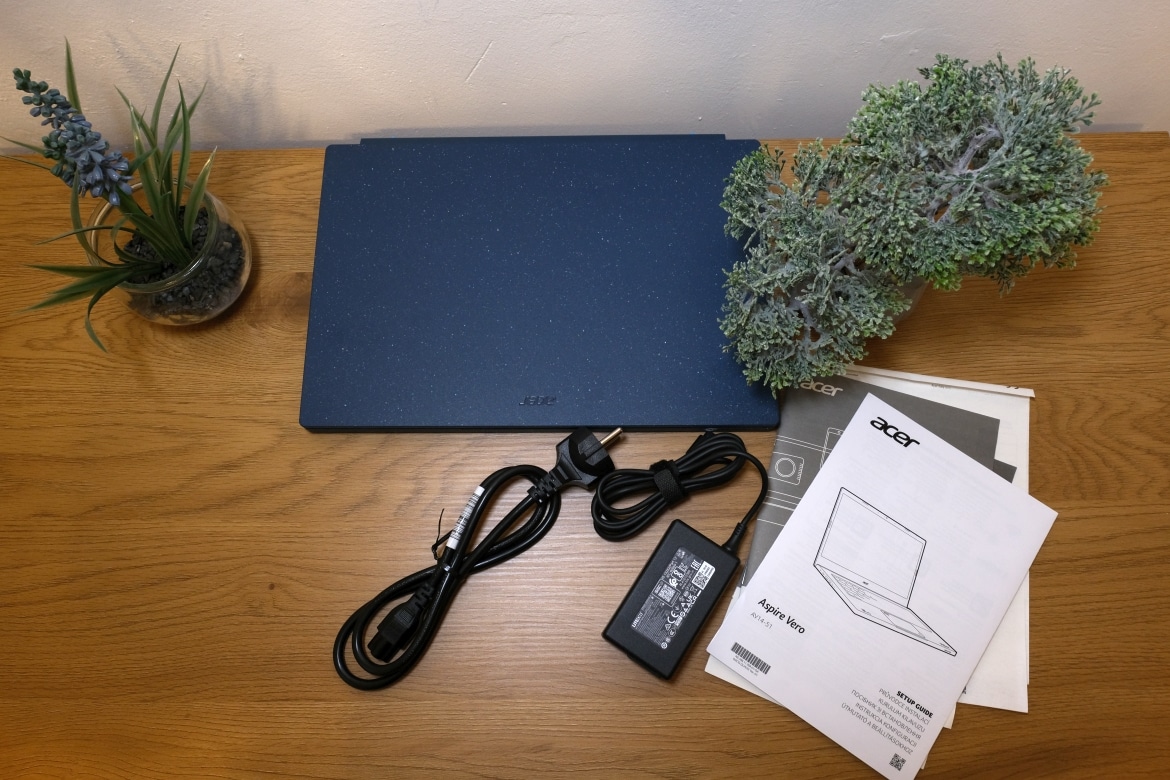 Das Acer Aspire Vero AV14 kommt entsprechend auch nur mit dem benötigten 65-Watt-Netzteil samt praktischem USB-C-Anschluss und dem obligatorischen Papierkram wie Anleitung oder Garantie daher.