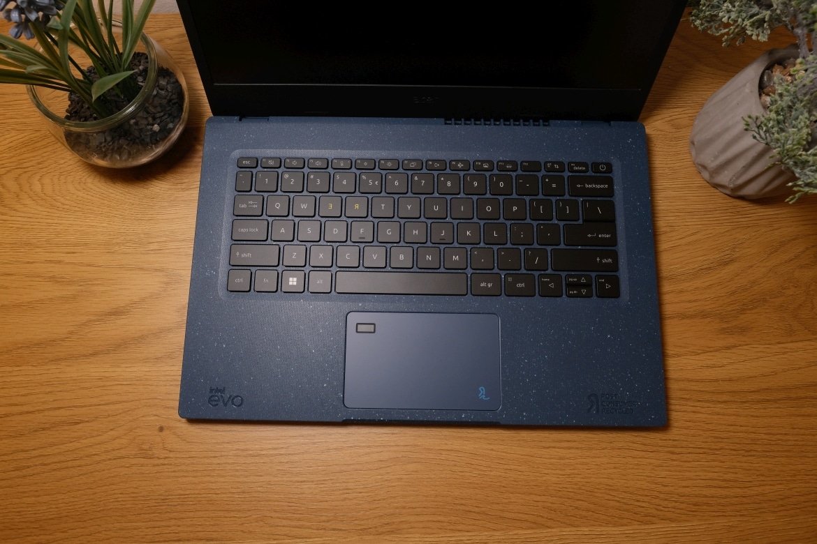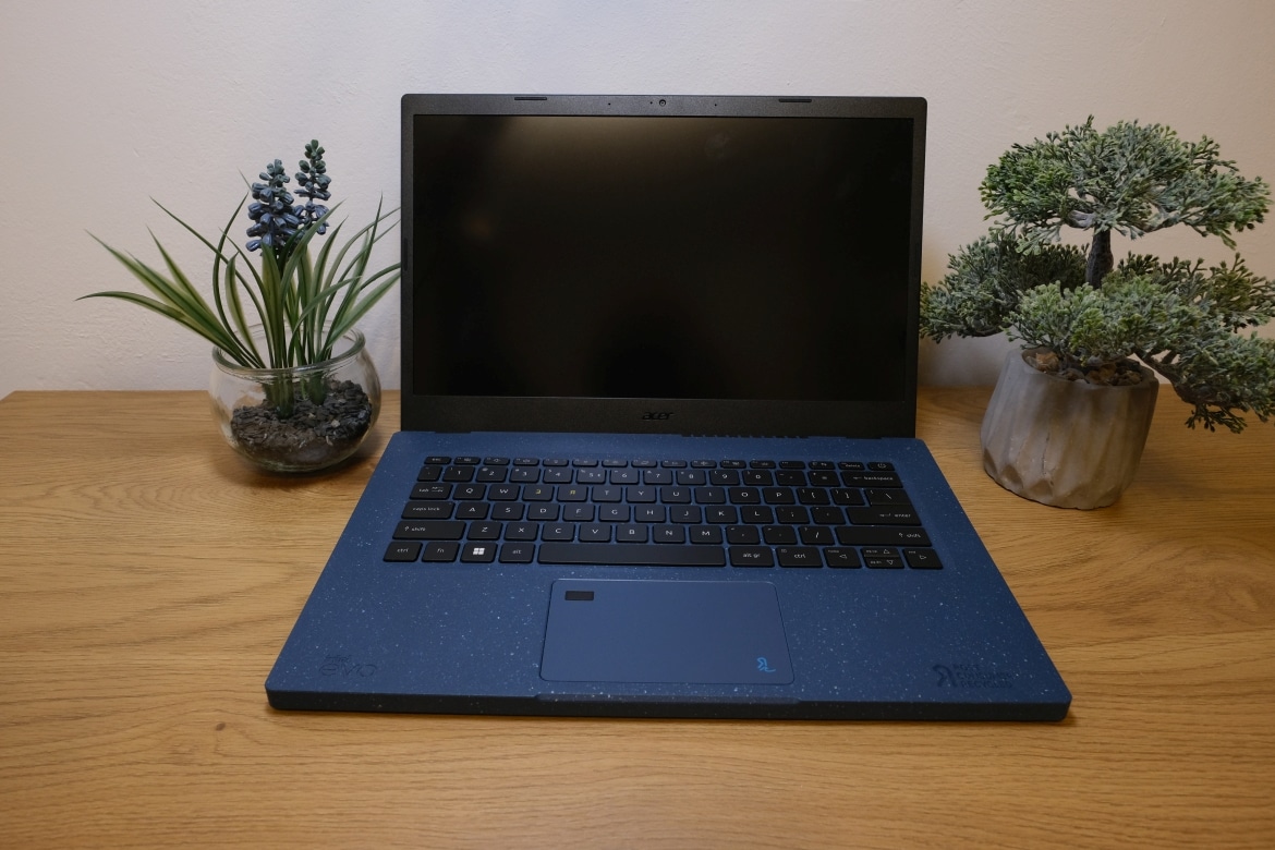 So unaufgeregt der Lieferumfang auch ist, so einzigartig fällt das Design des Laptops aus. Denn auch das Gehäuse, die Tastenkappen und vieles mehr besteht zu großen Teilen aus Recycling-Materialien – Kunststoff in diesem Fall.