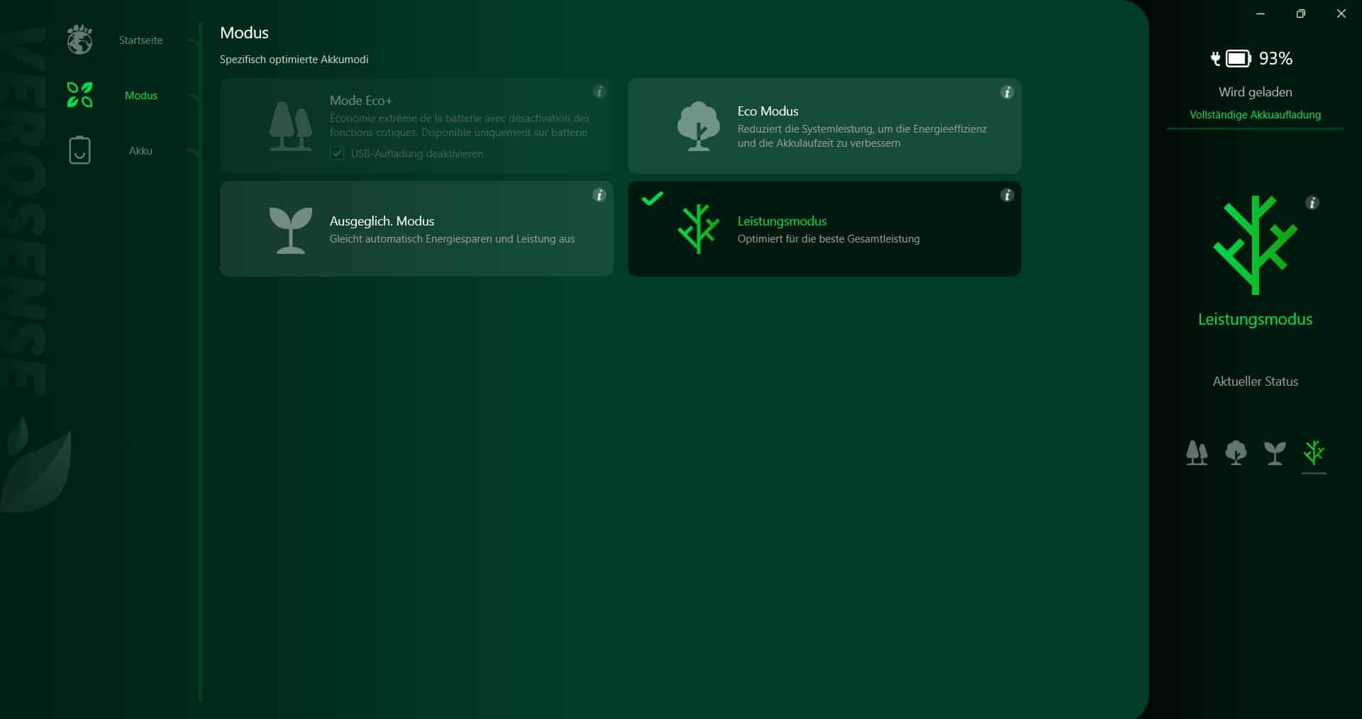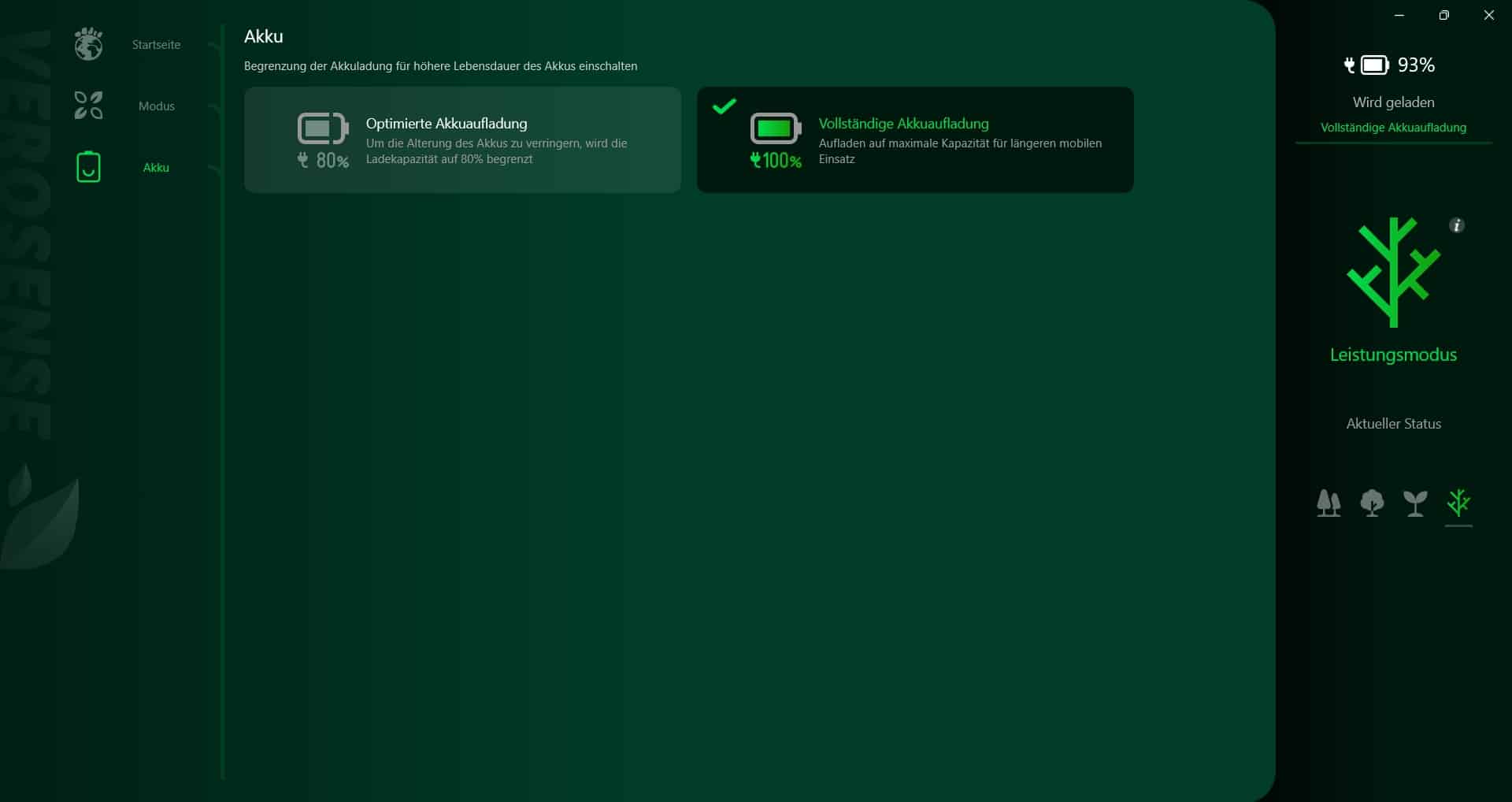 Bei den Modi stehen die Optionen Eco+ für die bestmögliche Energieeffizienz und längste Akkulaufzeit, Eco, Ausgeglichen und ein Leistungsmodus zur Wahl, in dem das Notebook die maximal mögliche Leistung abruft. Beim Akku hast du zudem die Wahl zwischen einer optimierten Aufladung (dabei wird die Ladekapazität auf maximal 80 Prozent begrenzt, um die Lebensdauer des Akkus zu verlängern) oder einer vollständigen Akkuaufladung.