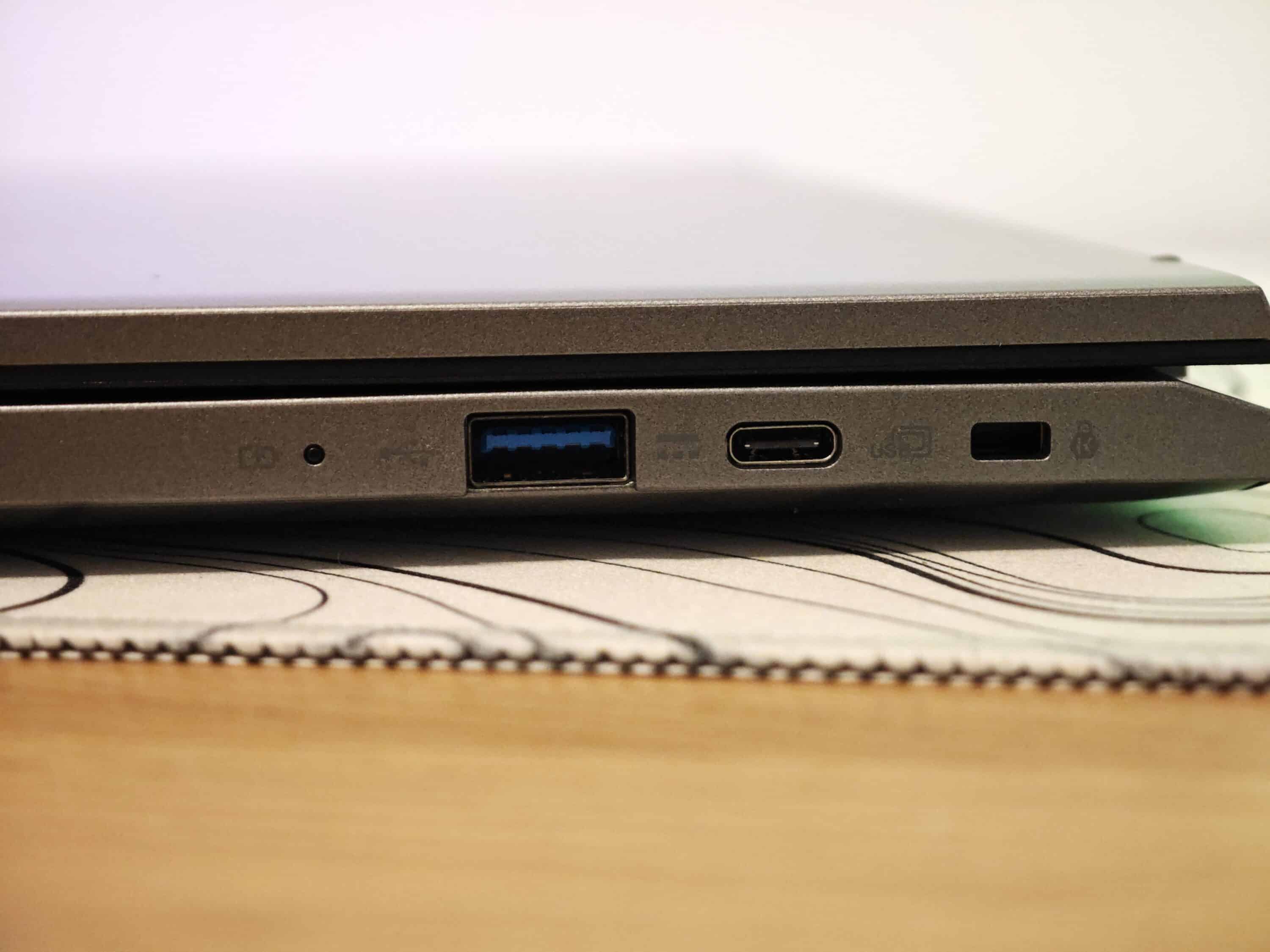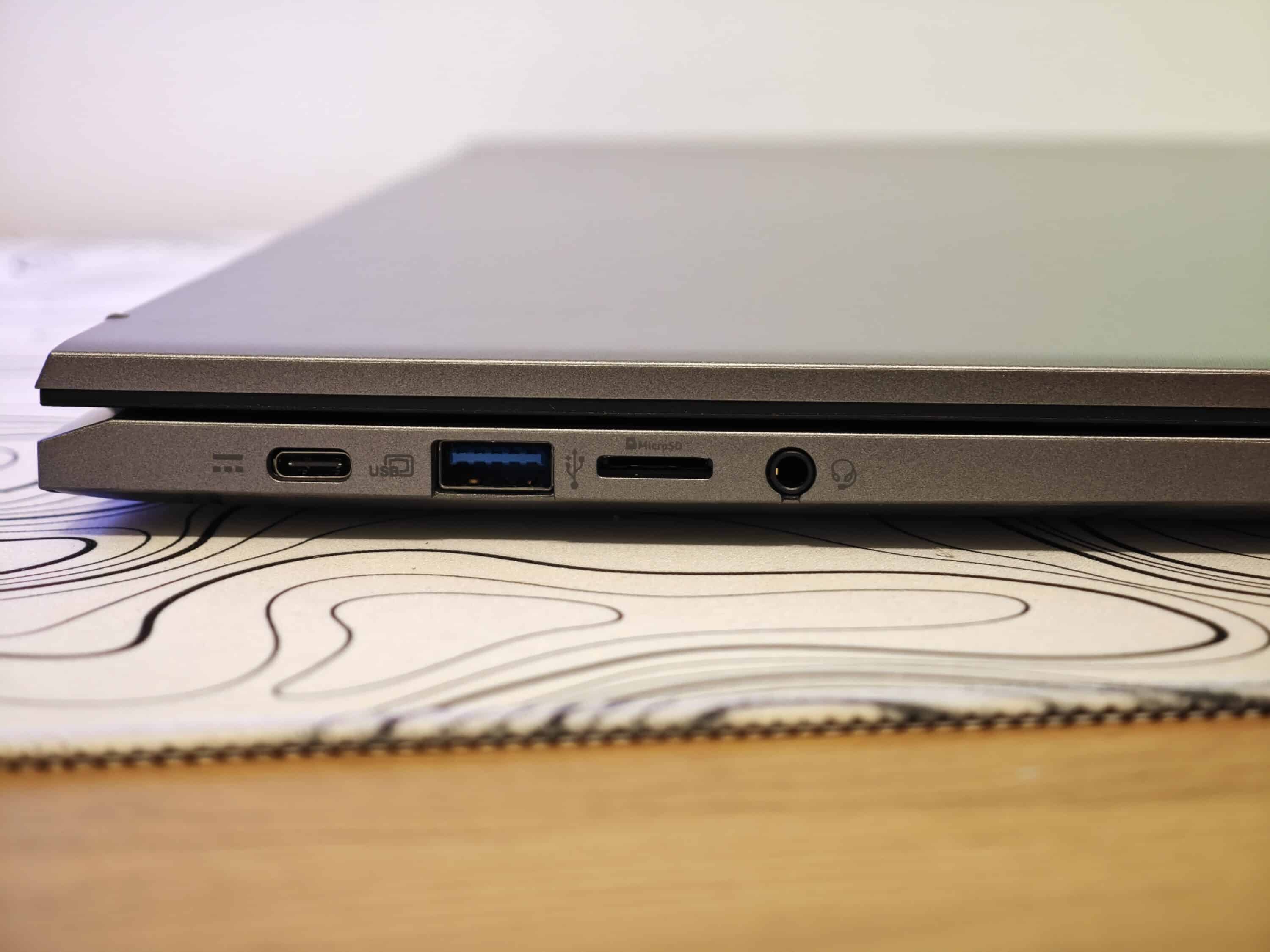 Gut gefällt, für ein Chromebook, die Anschlussauswahl des Acer Chromebook Plus 514. Auf der linken Seite stehen je einmal USB 3.2 Gen 1 Type C und USB 3.2 Gen 1 Type A neben einem microSD-Kartenleser und einem 3,5-mm-Klinkenanschluss zur Verfügung. Rechts kommen je ein weiterer USB-C- und USB-A-Port mit denselben Spezifikationen zum Einsatz.