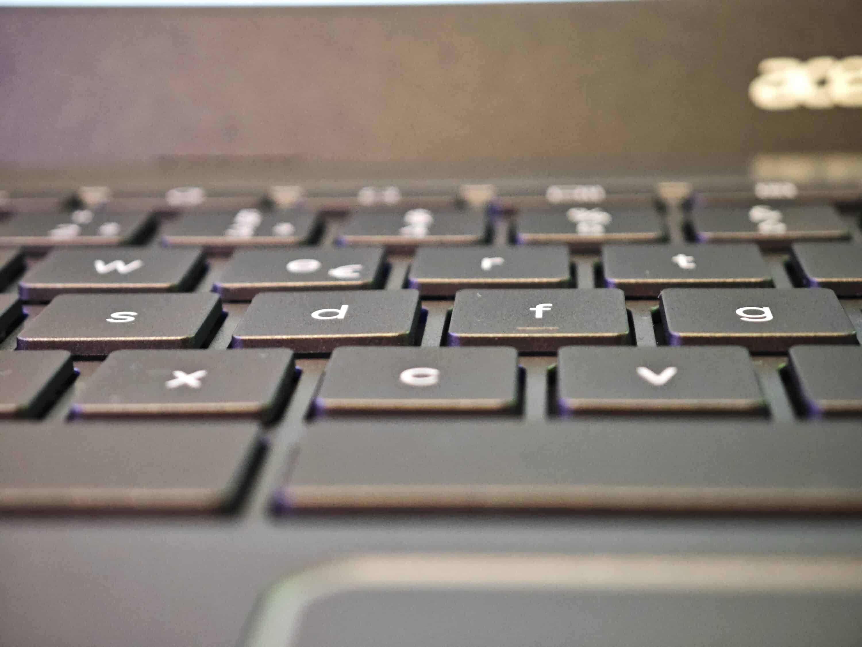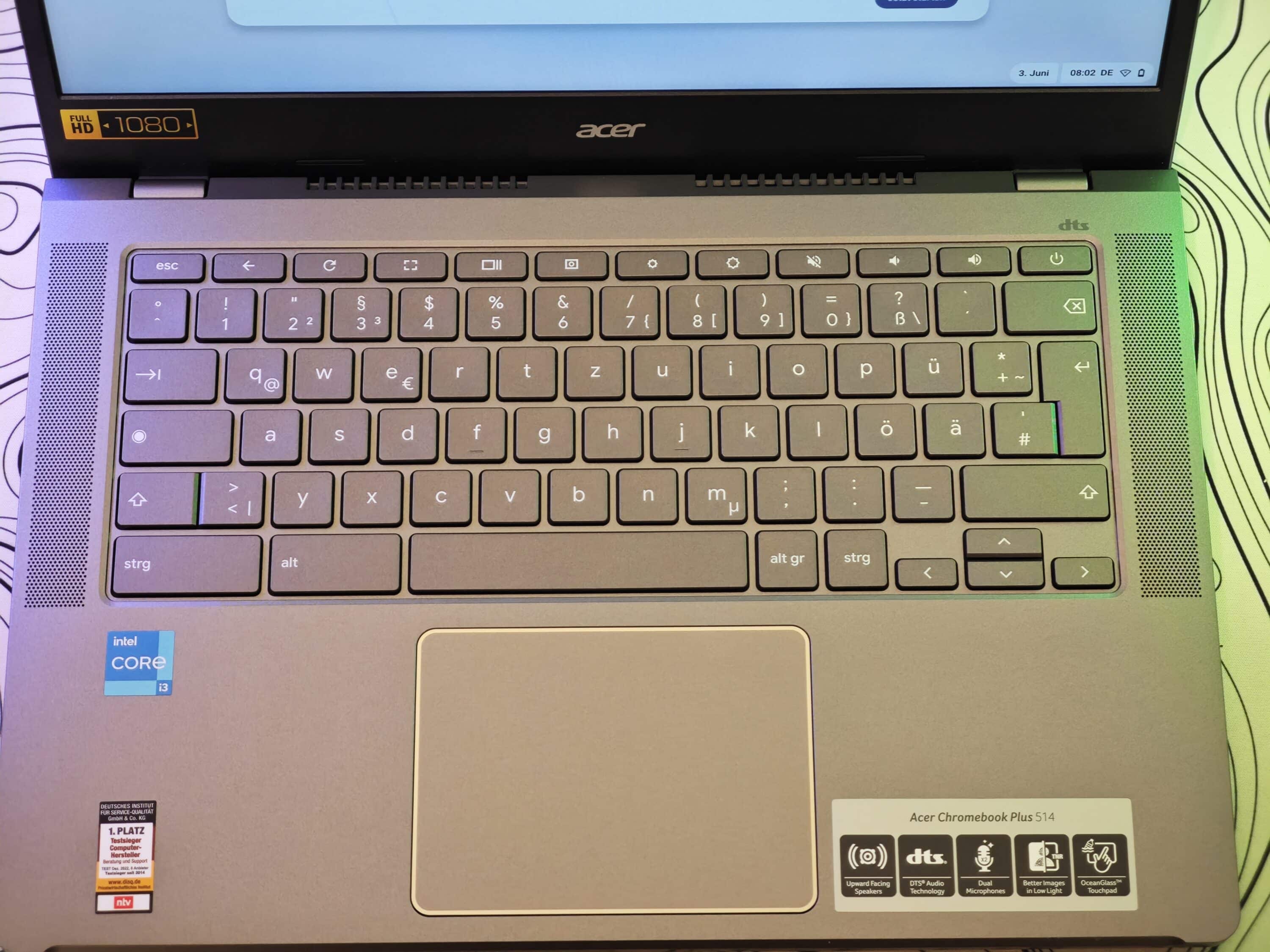 Gut gefällt zudem die Tastatur des Acer Chromebook Plus 514. Diese punktet mit angenehm großzügigen Tasten, präzisem Druckpunkt und ordentlichem Hub von rund 1,5 mm. Lediglich die Enter-Taste wirkt ein wenig gestaucht – hier wäre eine größere Taste wünschenswert gewesen. Stattdessen hätte man Strg und Alt etwas weniger Platz einräumen können, wenn es schon keine Windows-Taste gibt.