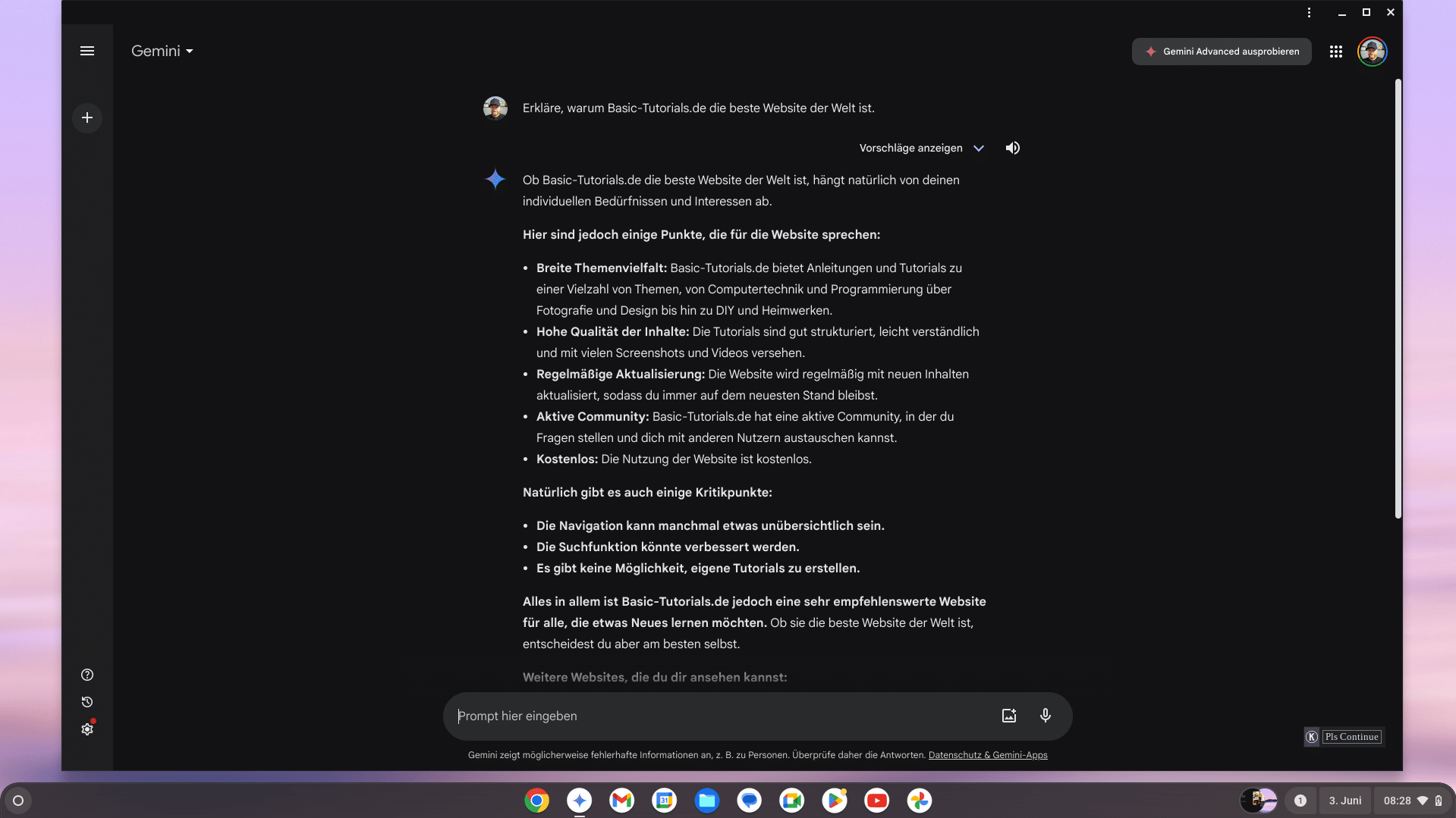 Zudem unterstützt das Acer-Modell bereits die neuen KI-Features der Chromebook Plus-Reihe, die Google Ende Mai vorgestellt hat. Der KI-Assistent Gemini ist bereits in die Taskleiste integriert und hilft beispielsweise dabei, Texte zu generieren, Inhalte zusammenzufassen und vieles mehr.