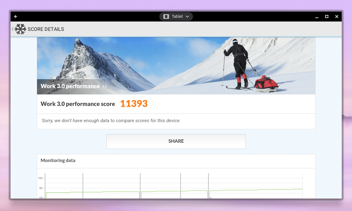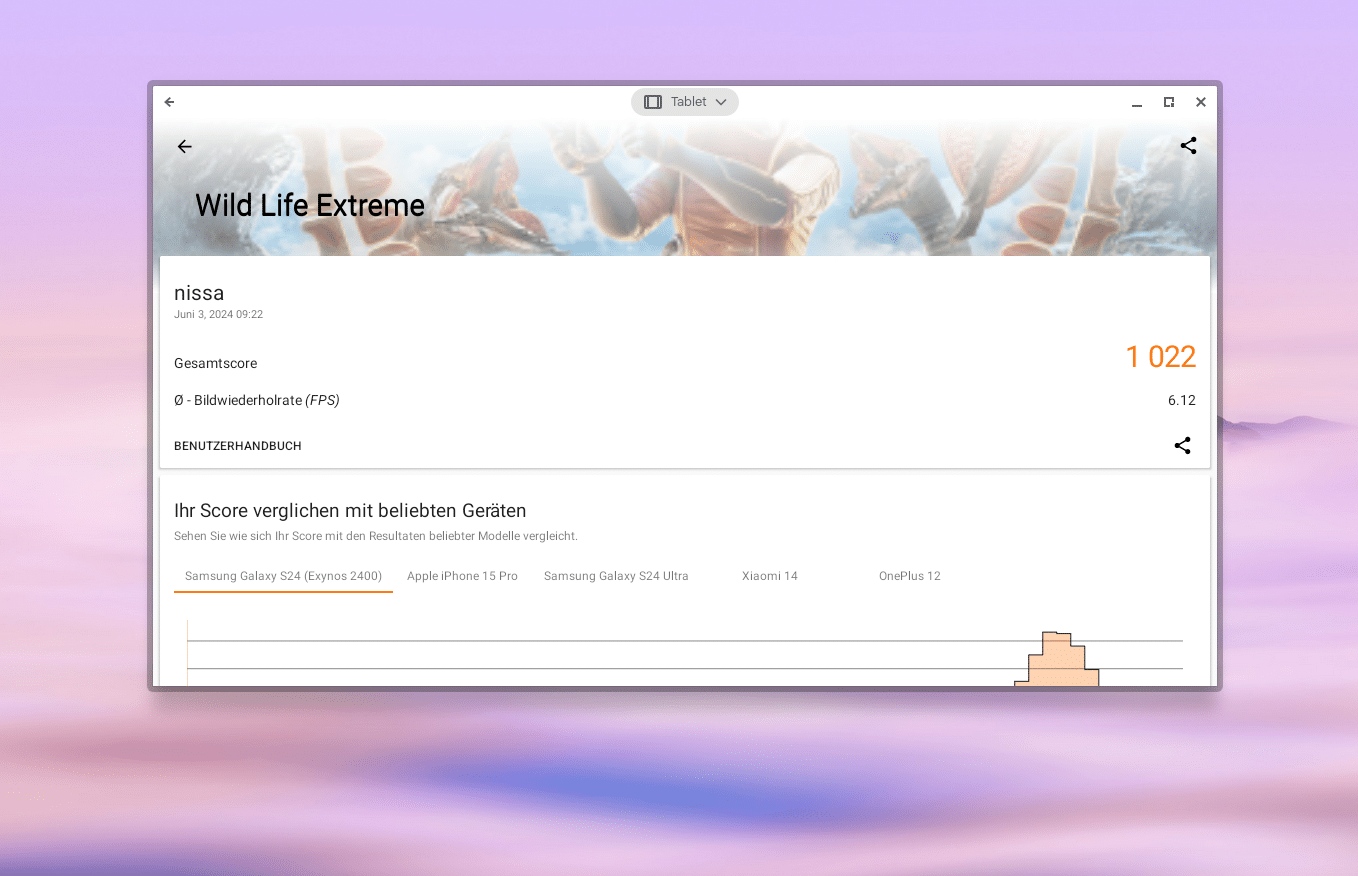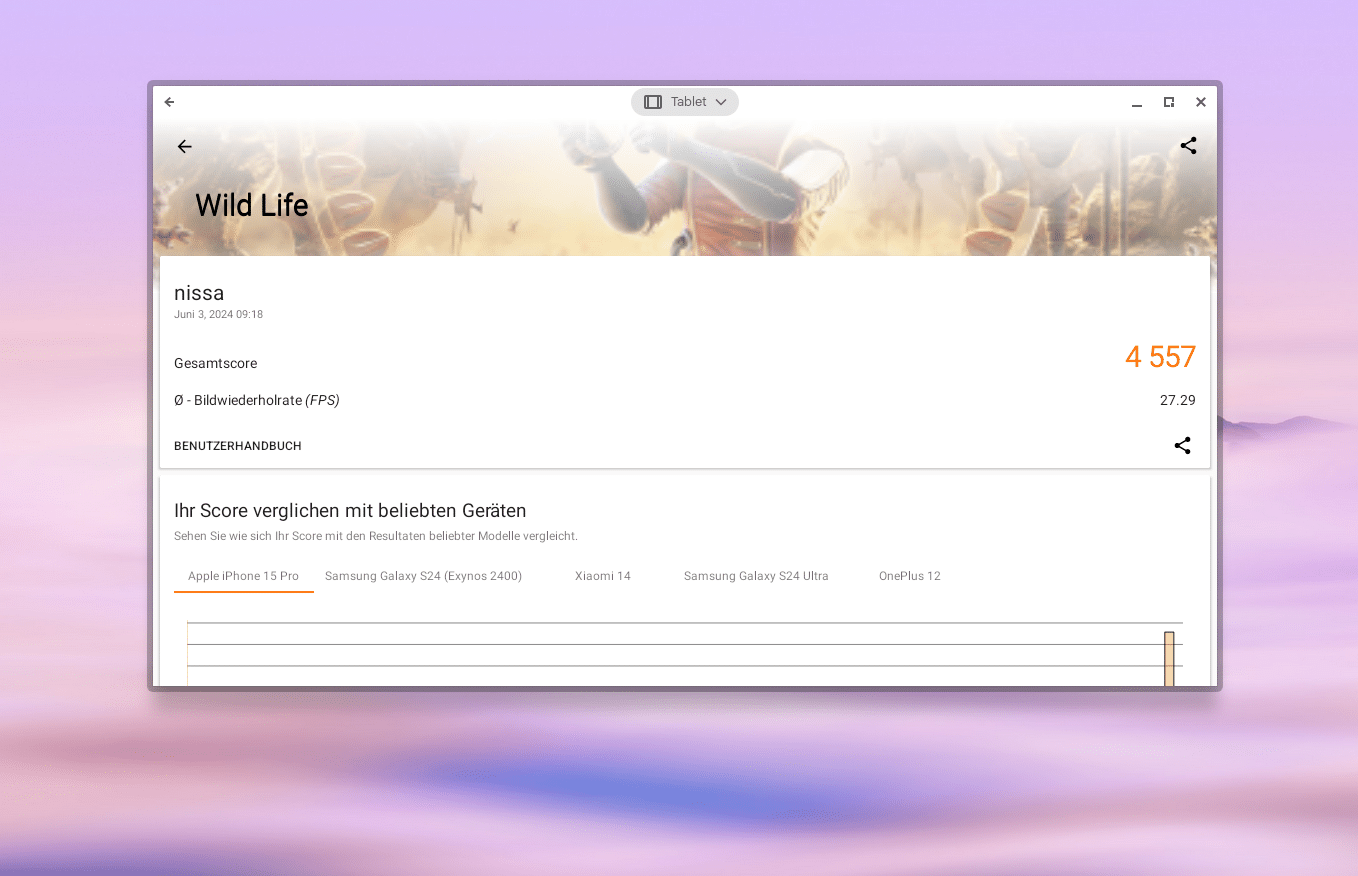 4.557 Punkte springen im Wild Life-Benchmark heraus. Zum Vergleich: Das sind rund 1.000 Punkte mehr als im aktuellen Mittelklasse-Smartphone Samsung Galaxy A55 (unser Test) – das eine oder andere Spiel aufwändigere lässt sich auf dem Chromebook als definitiv realisieren.
