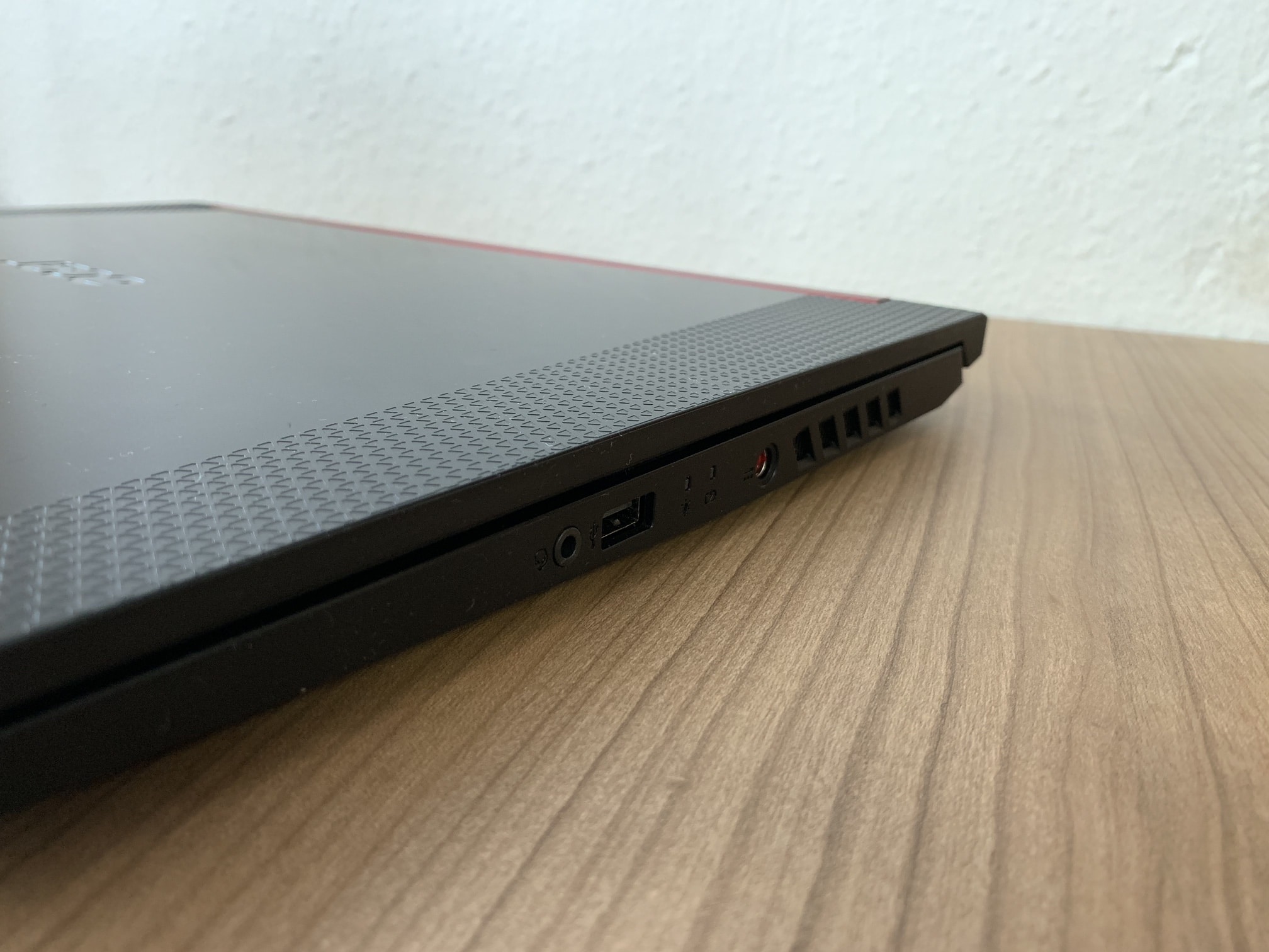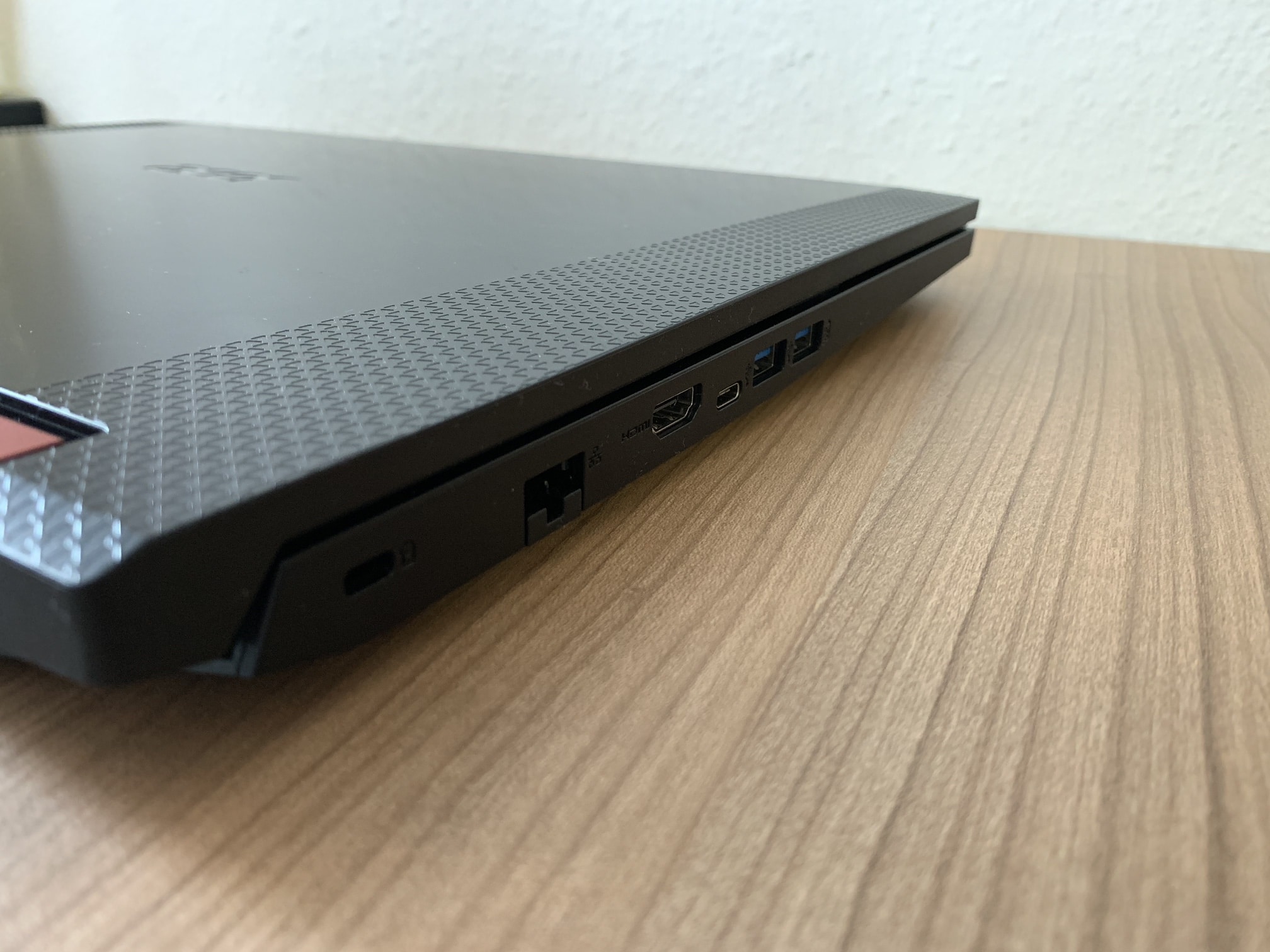 Unser Nitro 5 bietet einige Anschlüsse. Neben dem proprietären Stromanschluss sind auf der rechten Seite ein 3,5-mm-Klinken- und ein USB-2.0-Anschluss zu finden. Auf der linken Seite befinden sich zwei USB-3.0-Typ-A- und ein USB-3.0-Typ-C-Anschluss. Zudem befindet sich hier ein HDMI- und ein 1-GBbit-RJ45-LAN-Anschluss. Am Rand ist außerdem ein Kensington-Schloss zu finden.