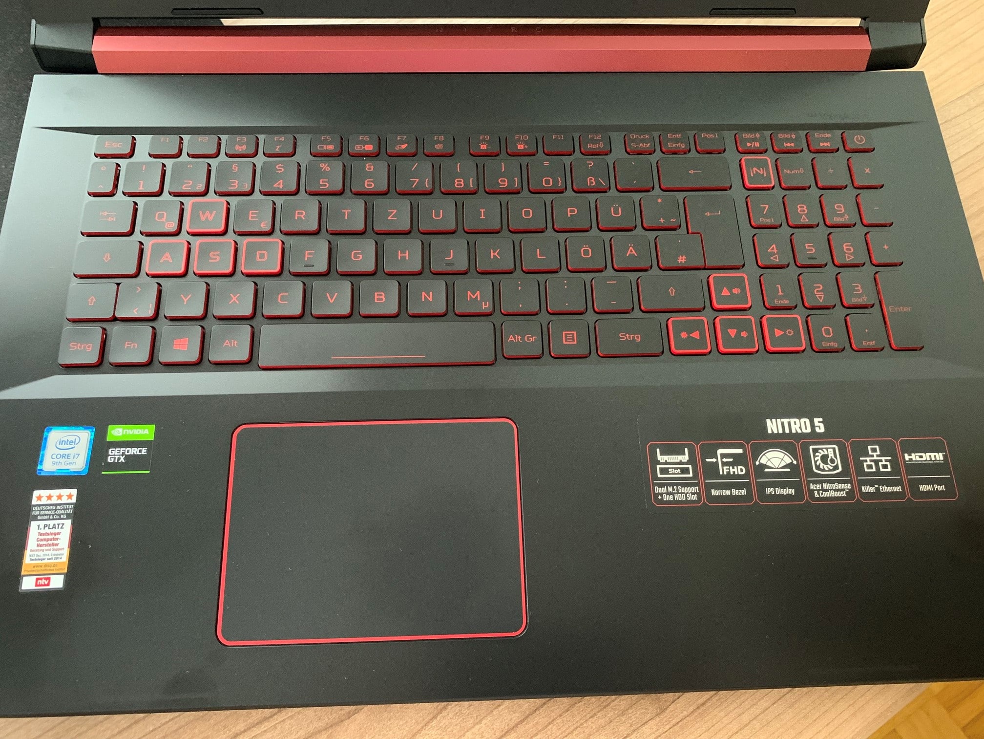 Insgesamt ist die Verarbeitung unseres Nitro 5 auf gutem Niveau. Tastatur und Touchpad sind durchschnittlich und die Verwindungssteifigkeit in Ordnung.
