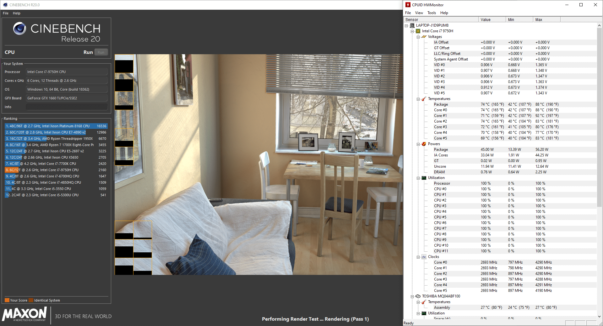 Beim Test unter Cinebench R20 fällt eines direkt auf: Auch bei mehrfacher Durchführung bleibt das Ergebnis gleich. Das Kühlsystem kann die durchschnittlichen 45 Watt der Intel CPU ohne Probleme abführen. Die CPU taktet dabei durchschnittlich auf 2,75 GHz bei 70-75°C – also minimal über dem Basistakt von 2,6 GHz – und das bei guten Temperaturen. Dürfte die CPU dauerhaft mehr als 45 Watt verbrauchen, wäre hier sicherlich noch Spielraum für dauerhaft höhere Taktraten.
