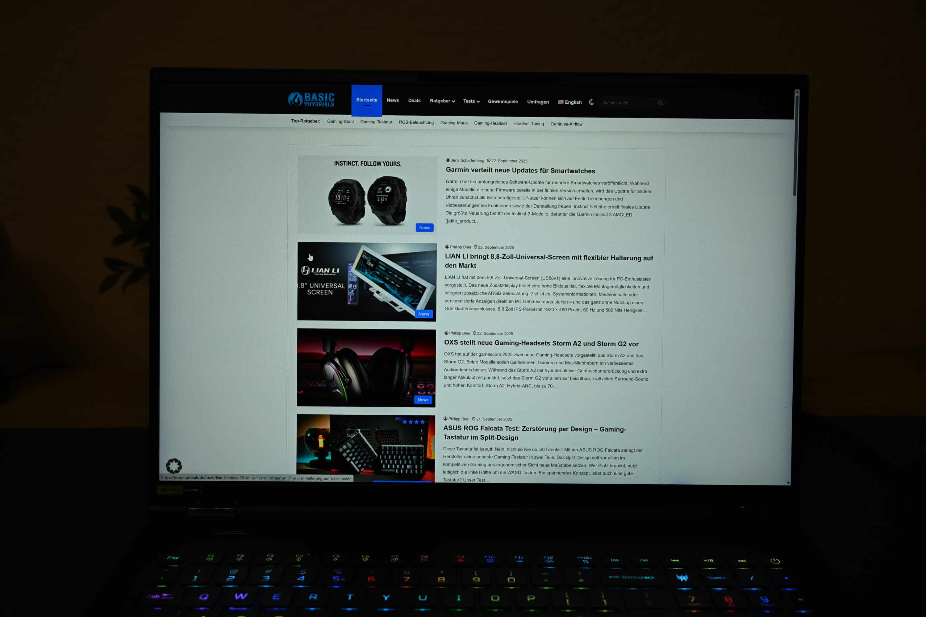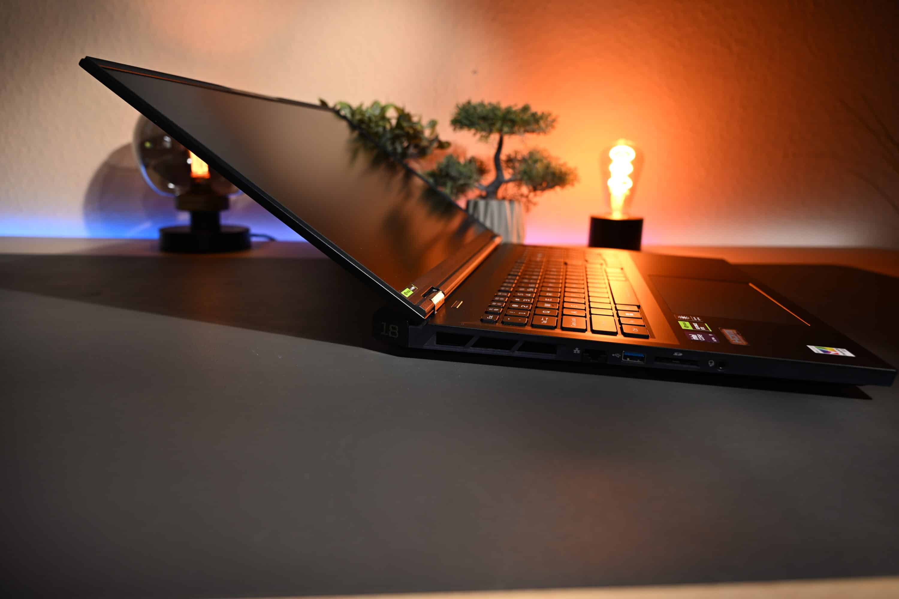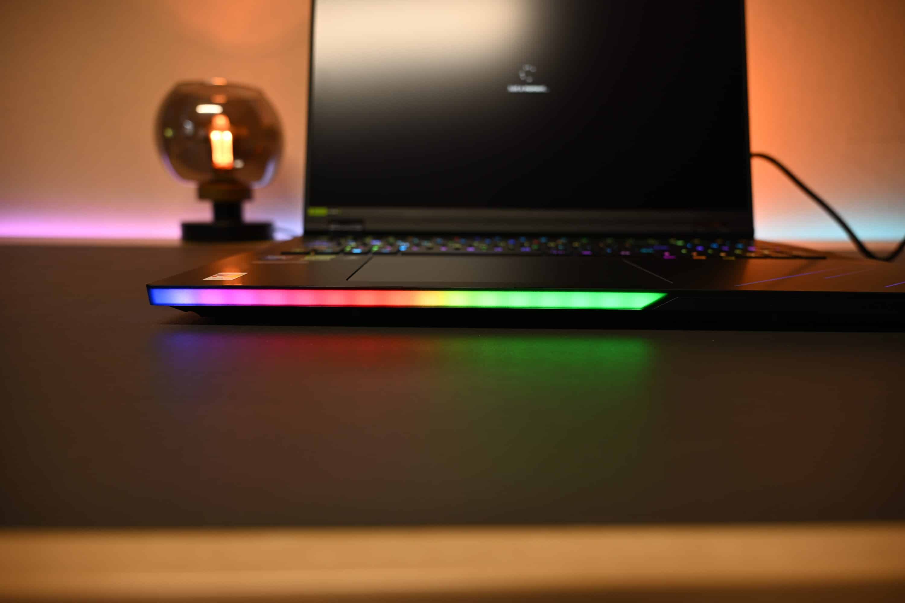 Mehr RGB habe ich bislang jedenfalls noch in keinem Gaming-Notebook gesehen. Diese Leiste hebt das Gerät besonders bei Dunkelheit hervor und verleiht ihm ein unverwechselbares Gaming-Flair. Natürlich lässt sich die Beleuchtung aber auch deaktivieren, wenn du da keinen Bock drauf hast.