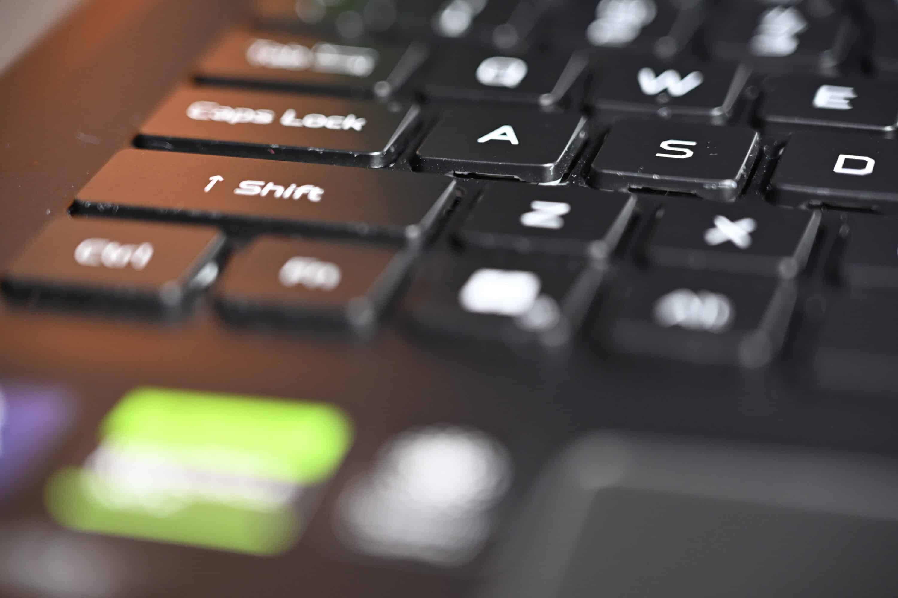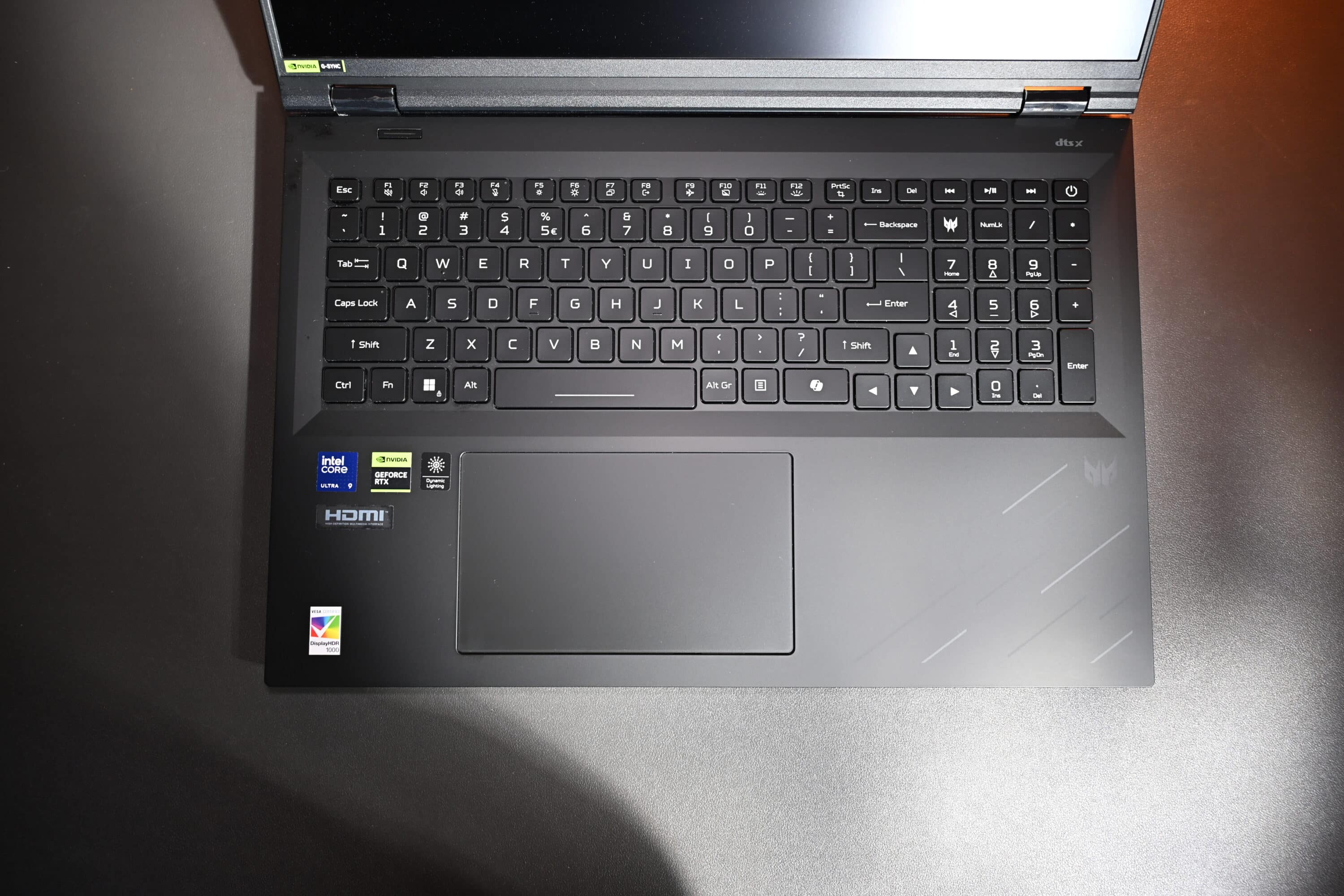 Bei der Verarbeitung zeigt der Predator eine solide Qualität: Die Scharniere halten den Bildschirm fest in Position, auch wenn der Deckel teilweise etwas abrupt schließt, wenn man das Gerät anhebt. Die ausgeräumte Unterseite mit großen Lüftungsöffnungen erleichtert die Kühlung, während die strukturierten Oberflächen von Tastaturbereich und Handballenauflage viel Grip und eine angenehme Haptik bieten. Die Tastatur ist RGB-beleuchtet und bietet Feedback im für Gaming-Notebooks guten Bereich, wobei die Tasten ausreichend Hub und eine gute Präzision liefern.