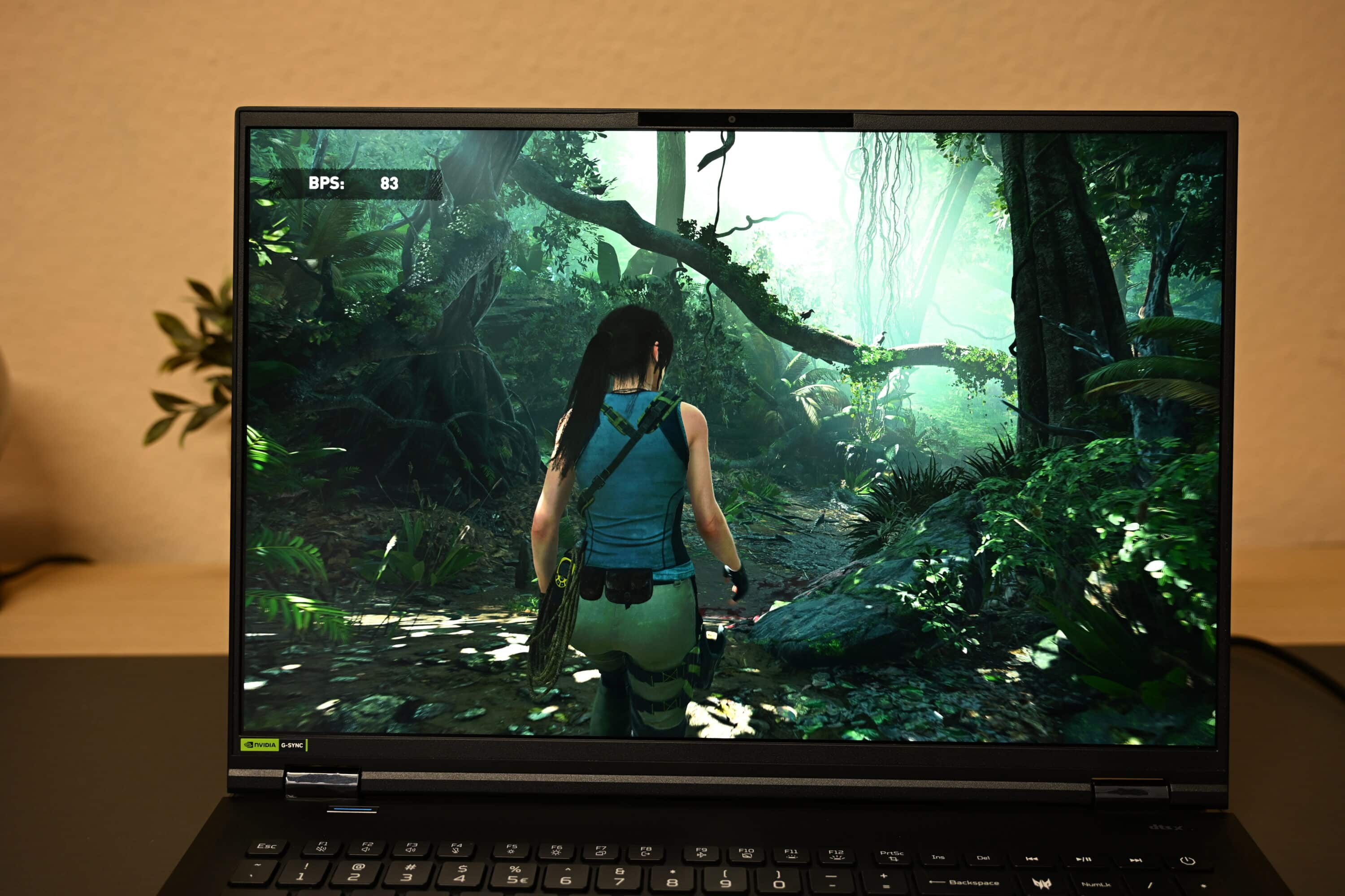 In der Praxis meistert das Acer-Notebook aber ebenfalls aktuelle Spiele in 4K+ Auflösung absolut flüssig. In F1 24 bei maximalen Details und hohem Raytracing springen am Ende 71 fps für ein flüssiges Spielerlebnis heraus. Cyberpunk 2077 meistert der Laptop mit 1080p im Raytracing Overdrive-Modus mit 125 fps.