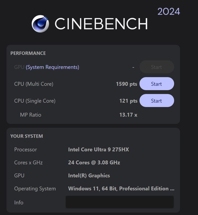 Die Performance in den reinen Cinebench-CPU-Tests hingegen liegt ebenfalls nicht ganz auf Augenhöhe mit anderen Notebooks, die den Core Ultra 9 275HX nutzen. Gerade die Multi-Core-Leistung rangiert deutlich unter denen der Konkurrenz. Zumindest im standardmäßig verwendeten ausgeglichenen Modus.
