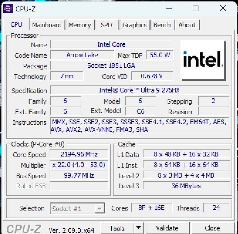 | Prozessor | Intel Core Ultra 9 Prozessor 275HX (24 Cores, 36 MB Cache gesamt, 2,7 GHz bis 5,4 GHz) |