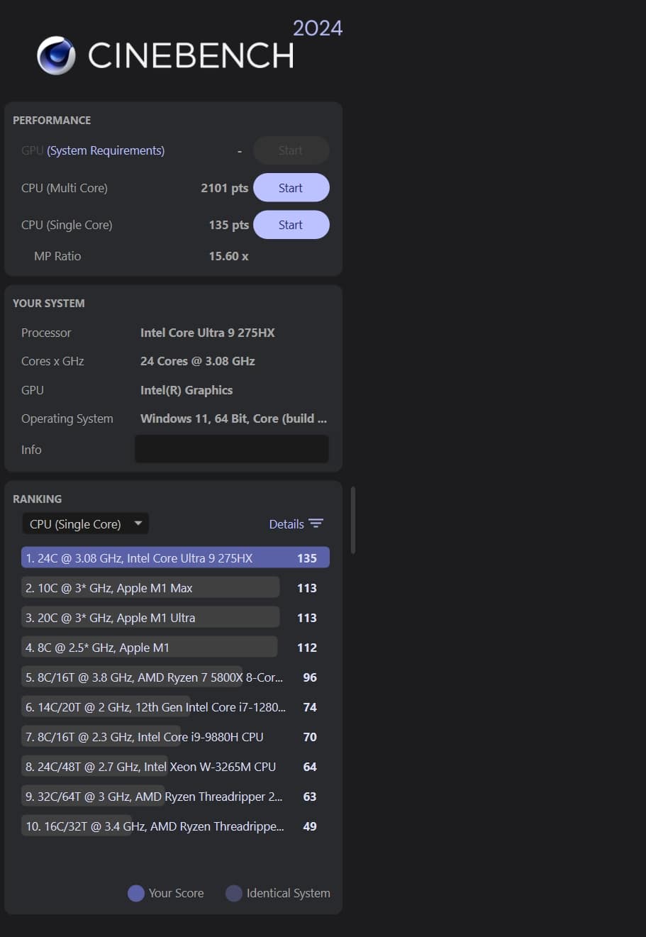 Auch bei der CPU- und Systemleistung gibt der Laptop eine exzellente Figur ab, wenngleich man insbesondere bei den CPU-Tests von Cinebench nicht ganz an der Leistungsspitze arfbeitet. Hier gibt es andere Gaming-Laptops mit Intel Core Ultra 9 275HX, die etwas mehr leisten. Dennoch sind die Werte auch hier herausragend.