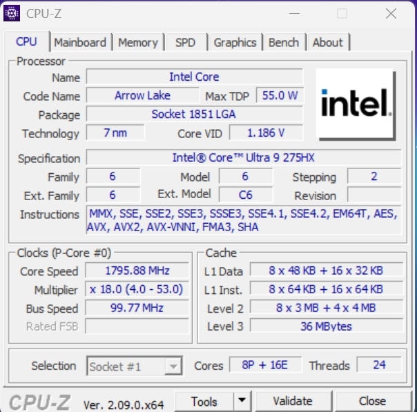 | Prozessor | Intel Core Ultra 9 Prozessor 275HX (24 Cores, 36 MB Cache gesamt, 2,7 GHz bis 5,4 GHz) |