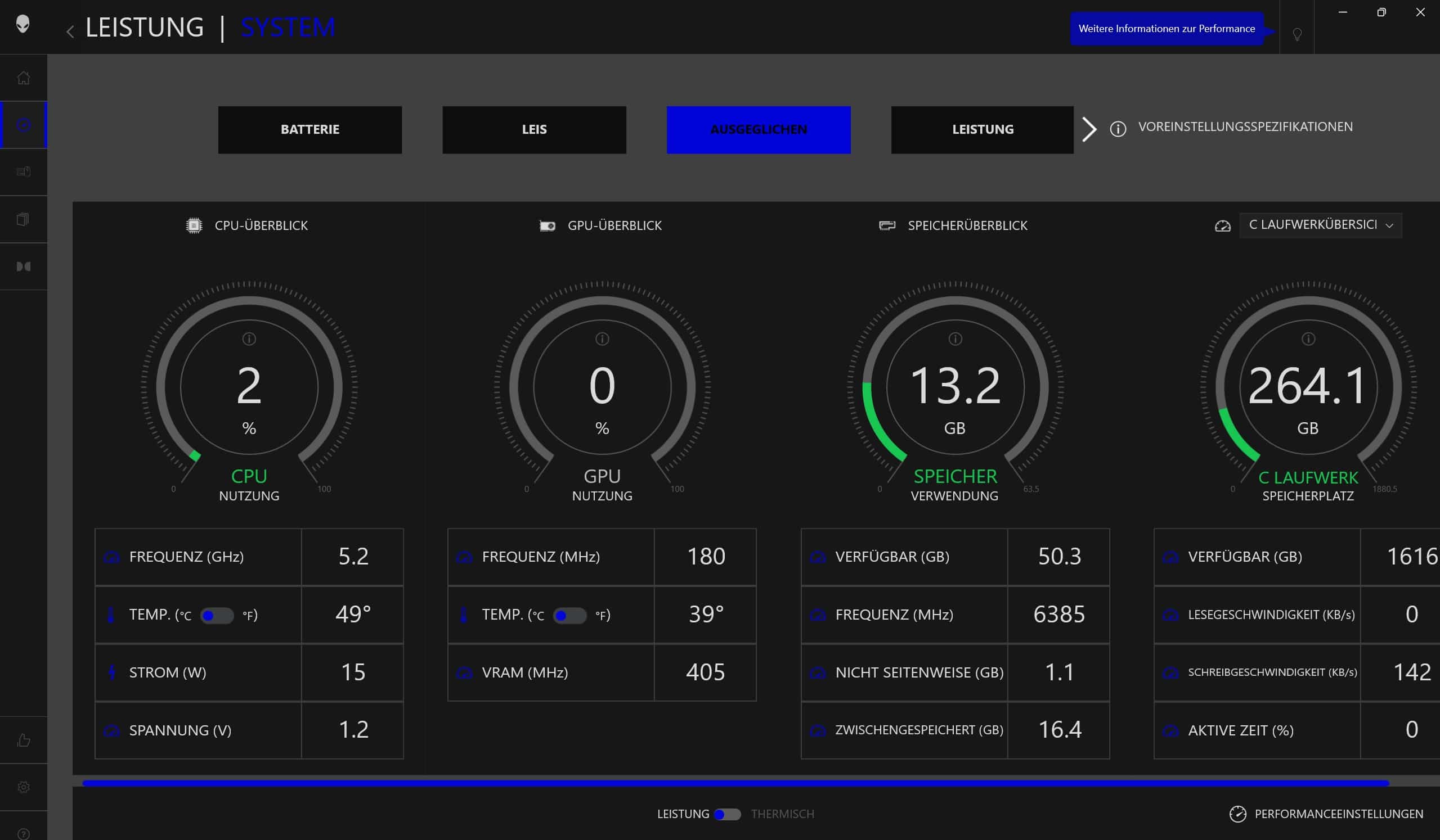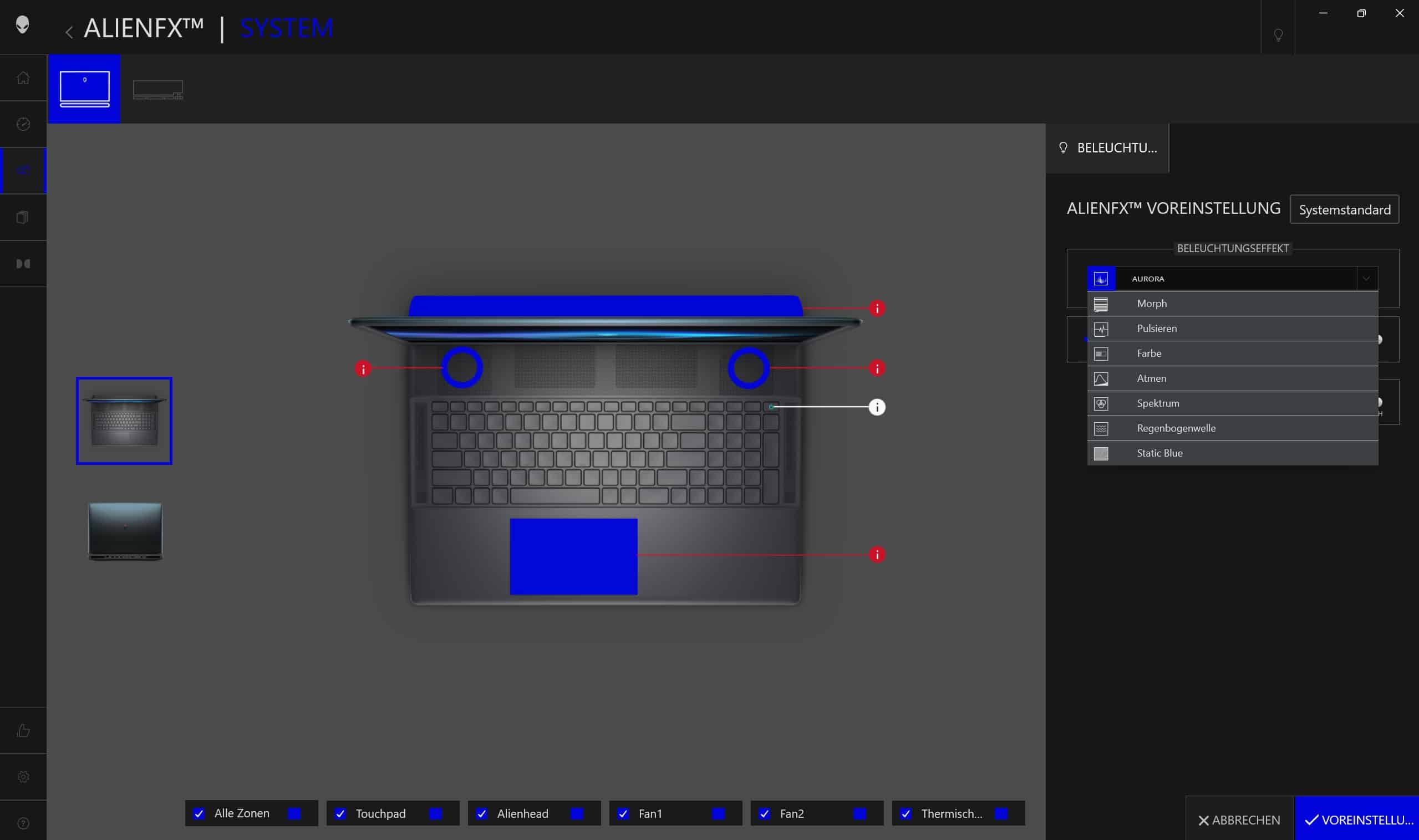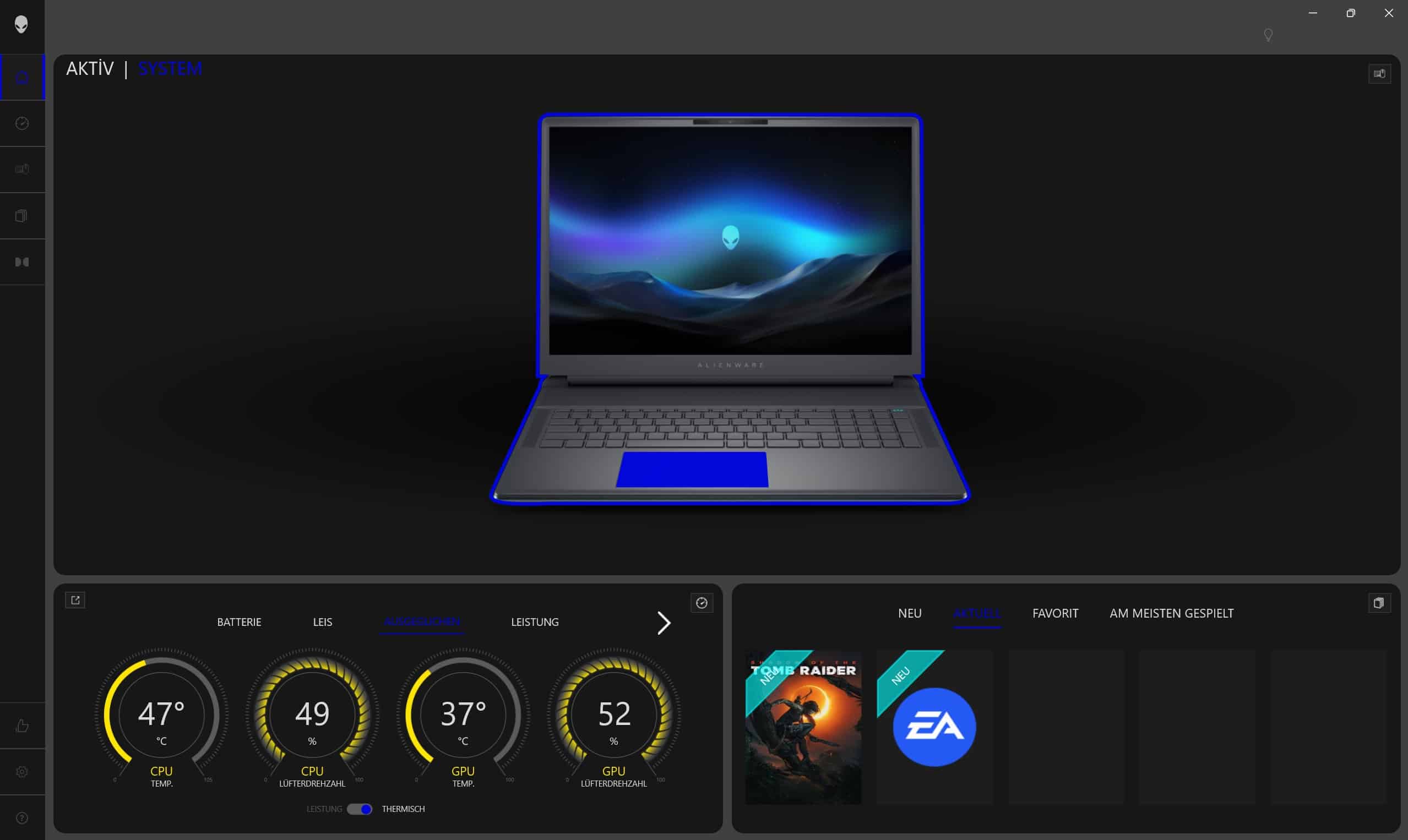 Als Software kommt das Alienware Kontrollzentrum zum Einsatz. Es informiert in einem übersichtlichen Design über die CPU- und GPU-Auslastung sowie die Temperaturen und erlaubt eine Anpassung der RGB-Beleuchtung. Wahlweise für jede Zone individuell oder für das gesamte System.