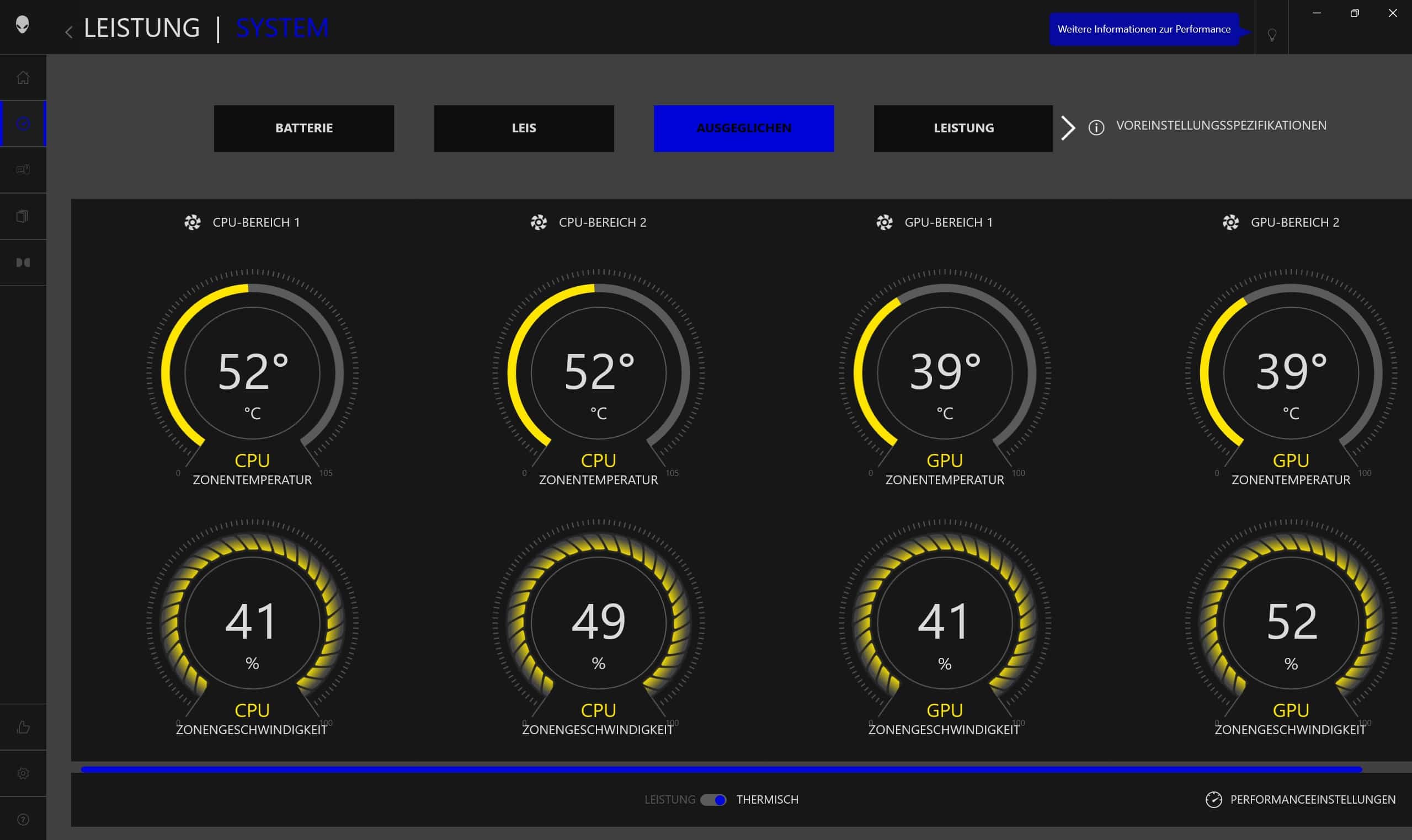Zudem lassen sich hier vier Leistungsprofile einstellen, die in der Tat merkliche Auswirkungen auf die Performance, aber auch die Lautstärke haben. Doch dazu gleich mehr.