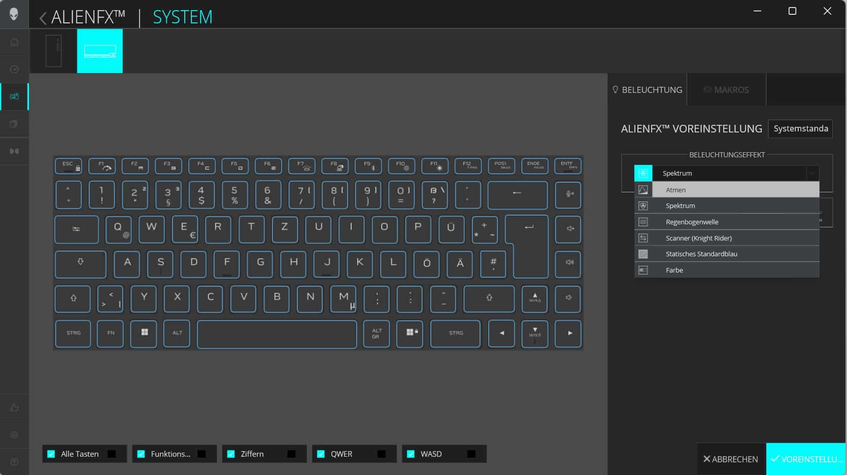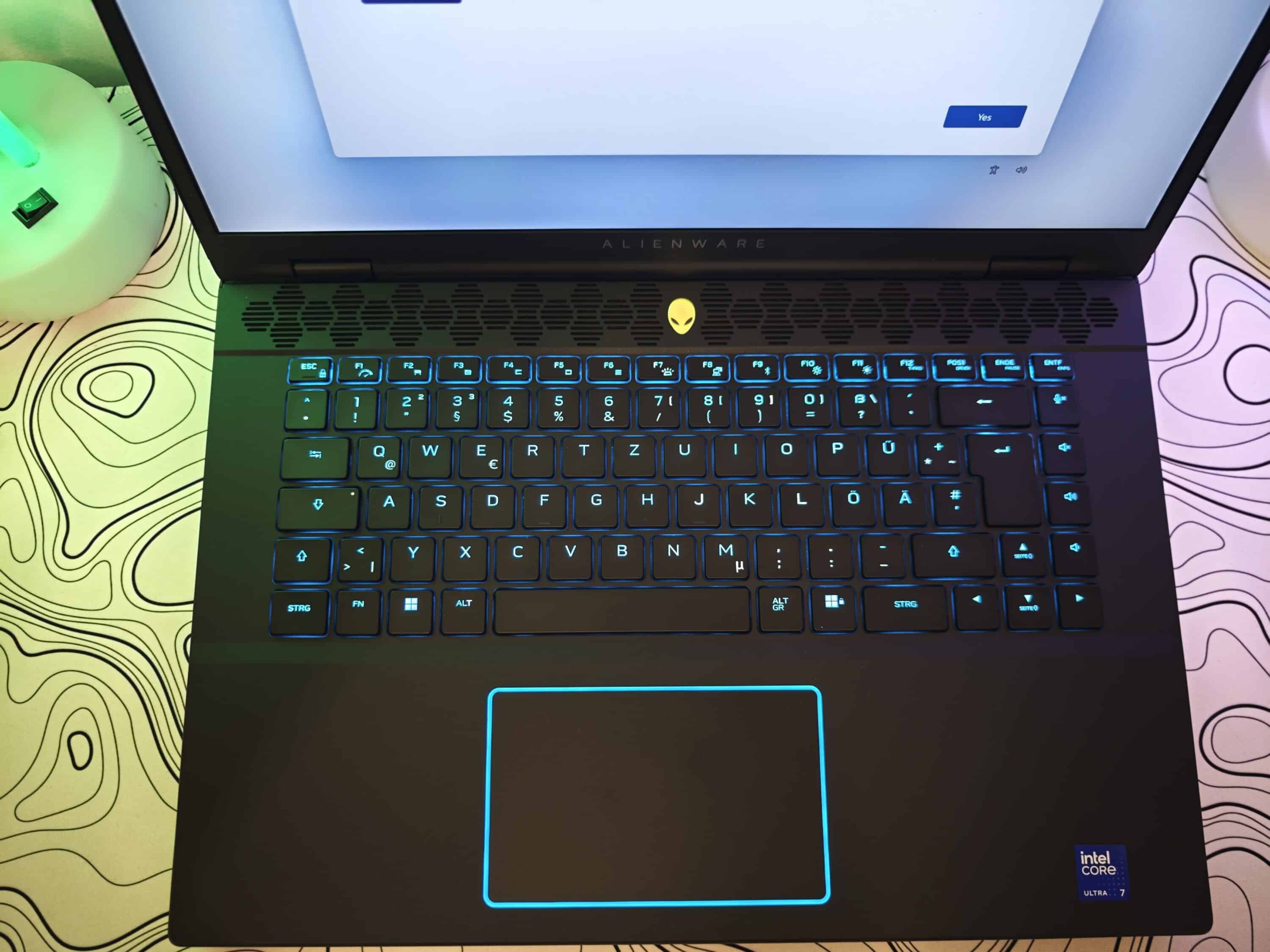 Der Power-Button findet sich, in Form des Alienware-Schädels, oberhalb der Tastatur. Er verfügt über eine RGB-Beleuchtung, die genau wie die der einzelnen Tasten in der Begleit-App eingestellt werden kann. Auch das Clickpad, das in einer Größe von 11,5 cm x 7 cm daherkommt, verfügt über einen beleuchteten Rahmen, dessen Farbe ebenfalls angepasst werden kann.