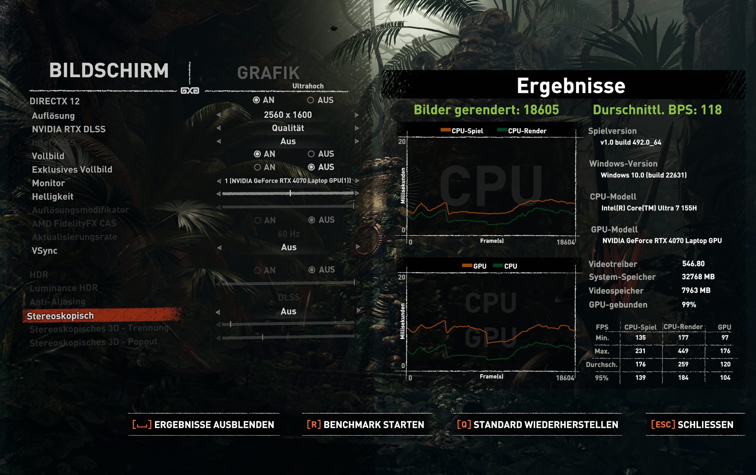 Gerade in den Graphic Scores von 3DMark hat das Alienware m16 R2 die Nase vorne und das mitunter deutlich. Auch in F1 22 oder Final Fantasy XV punktet das Alienware-Notebook mit einer starken Performance, die deutlich mehr fps abrufen kann als die Konkurrenz. In anderen Titeln wie beispielsweise Shadow of the Tomb Raider hingegen, ein Spiel das die CPU stark beansprucht, liefert das HP Notebook bessere Ergebnisse.