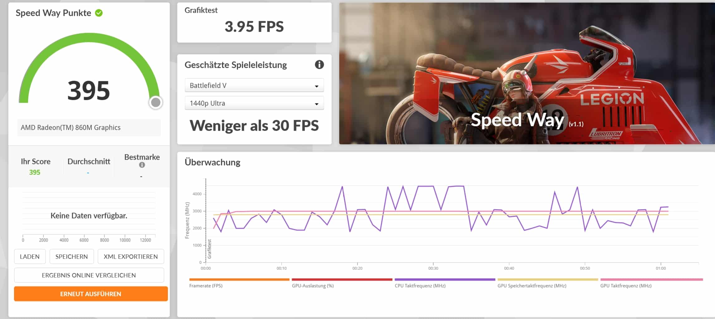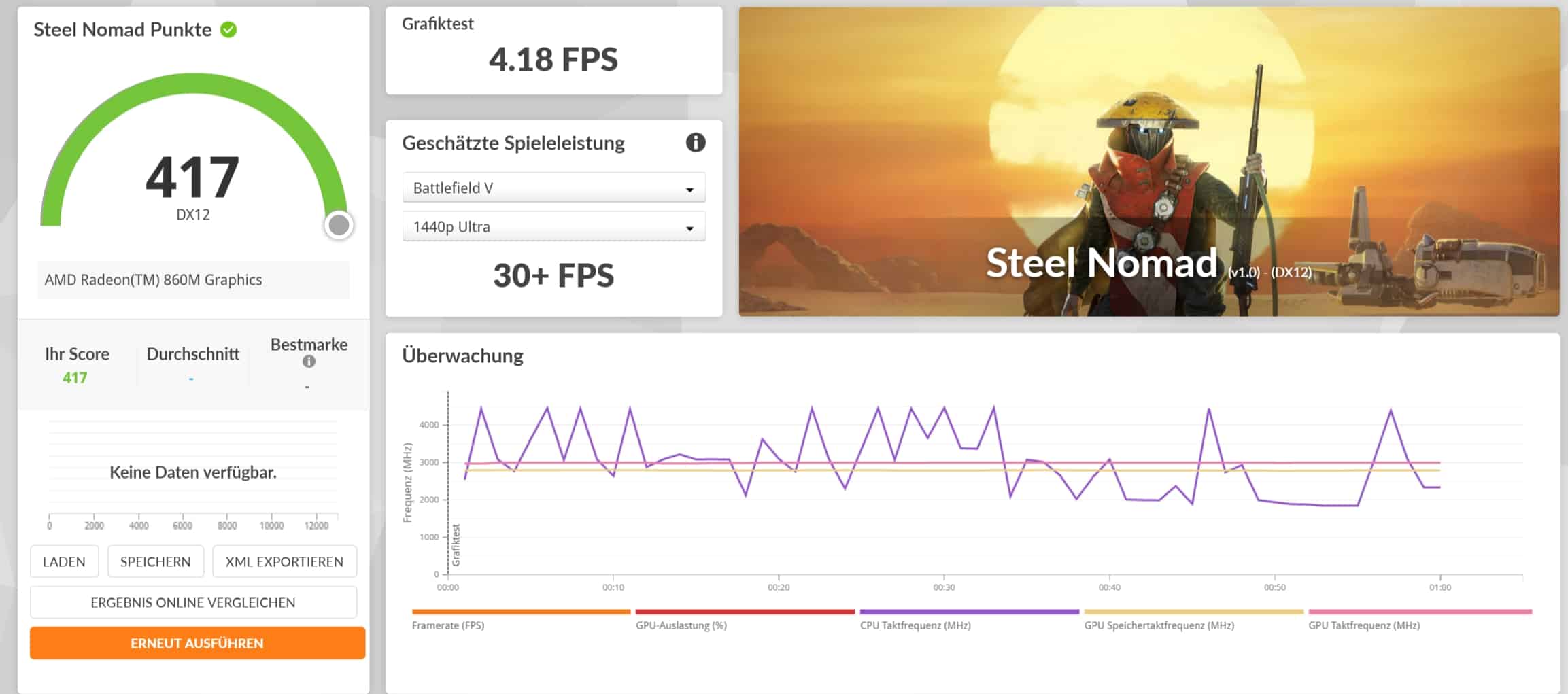 Eine kleine Leistungssteigerung im Vergleich zur vorherigen Ryzen-Generation zeigt sich auch in der Grafikleistung, wo die AMD Radeon 860M selbst die vorangegangene Radeon 780M in realen Tests knapp schlägt. Bei den synthetischen Benchmarks hat aber die 780M stellenweise minimal die Nase vorn.