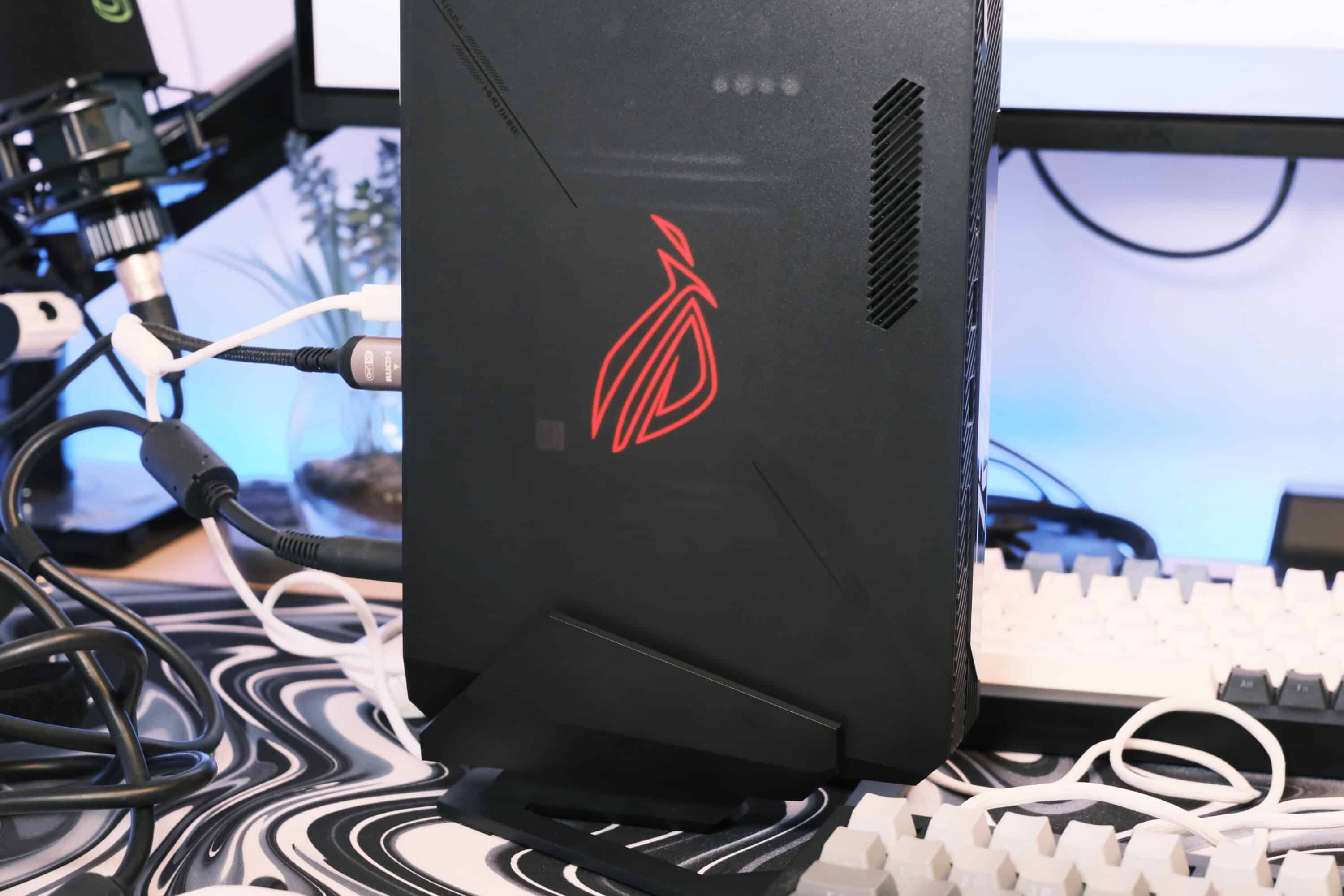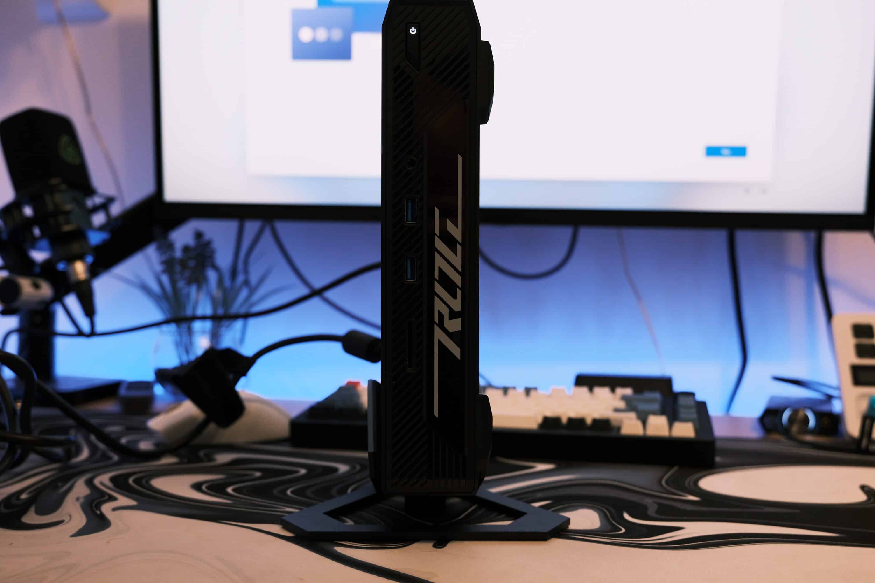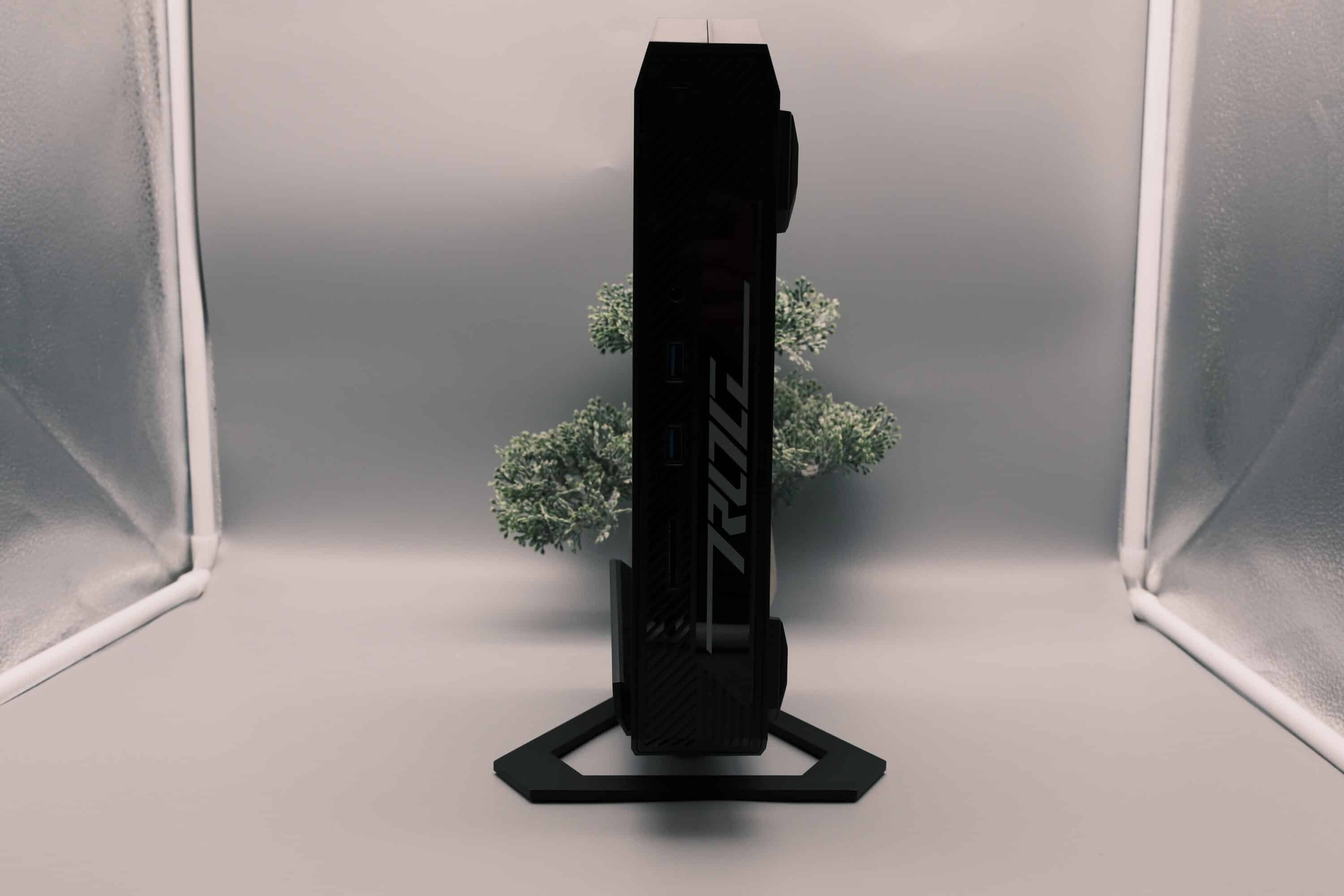 Wer sich für letzteres entscheidet, kann den ROG NUC in den im Lieferumfang enthaltenen Standfuß einsetzen, der dank gepolsterter Innenseiten das etwas angfällige Gehäuse nicht verkratzt.