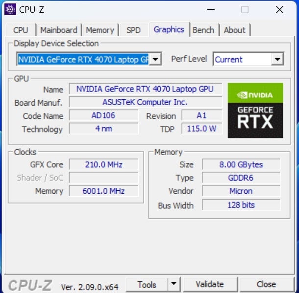 | Grafikleistung | Nvidia GeForce RTX 4070 (8GB GDDR6 VRAM); 140 W TDP |