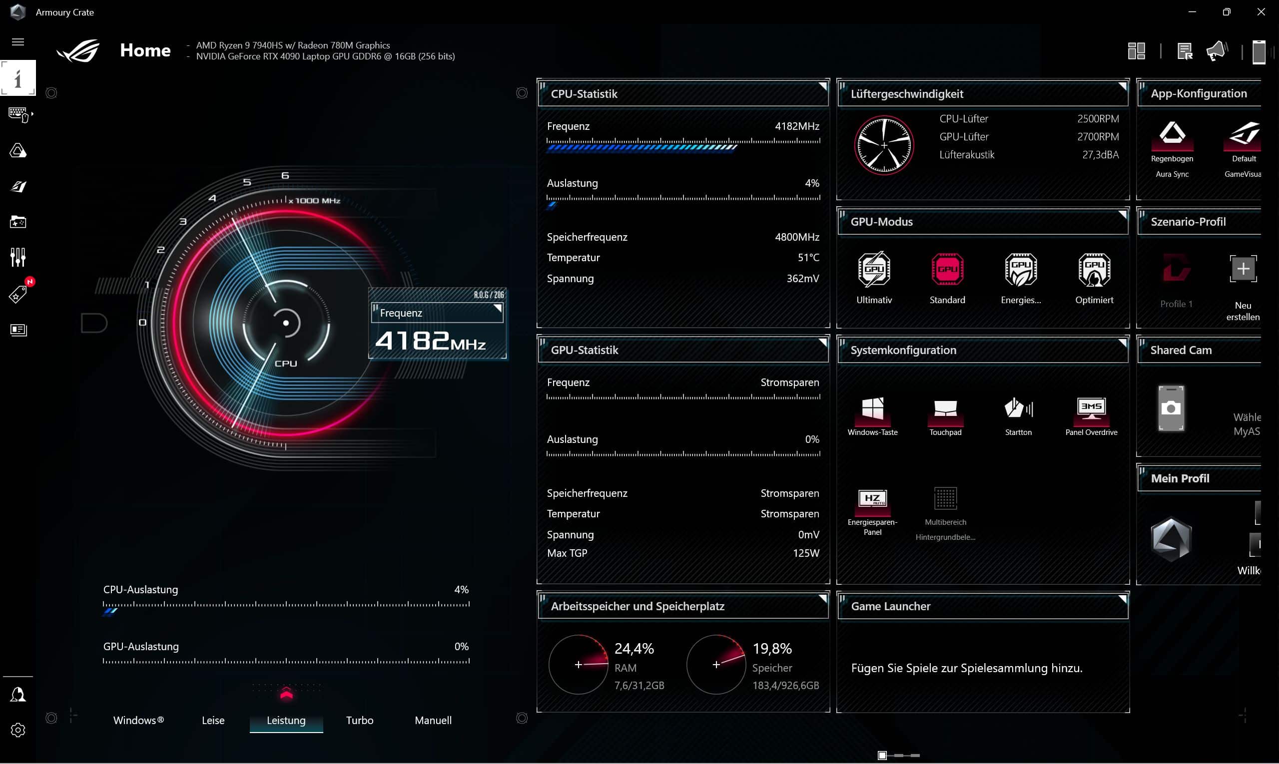 Außerdem kam in den Tests das standardmäßig aktivierte Profil „Leistung“ zum Einsatz. Wählst du in Armoury Crate das Profil „Turbo“ aus, kannst du nochmal ein paar mehr FPS herauskitzeln.
