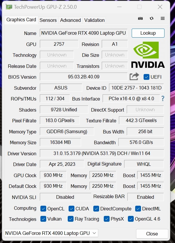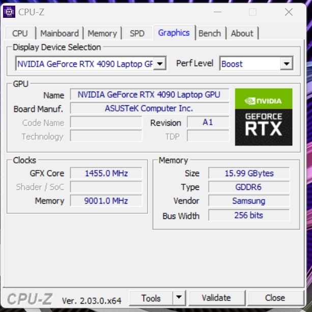 Dem Prozessor steht mit der NVIDIA GeForce RTX 4090 das aktuelle GPU-Top-Modell zur Seite, das mit 16 GB VRAM aufwartet und – im Turbo-Modus – auf eine TGP von maximal 125 Watt zurückgreifen darf (100 Watt TGP + 25 Watt Dynamic Boost).