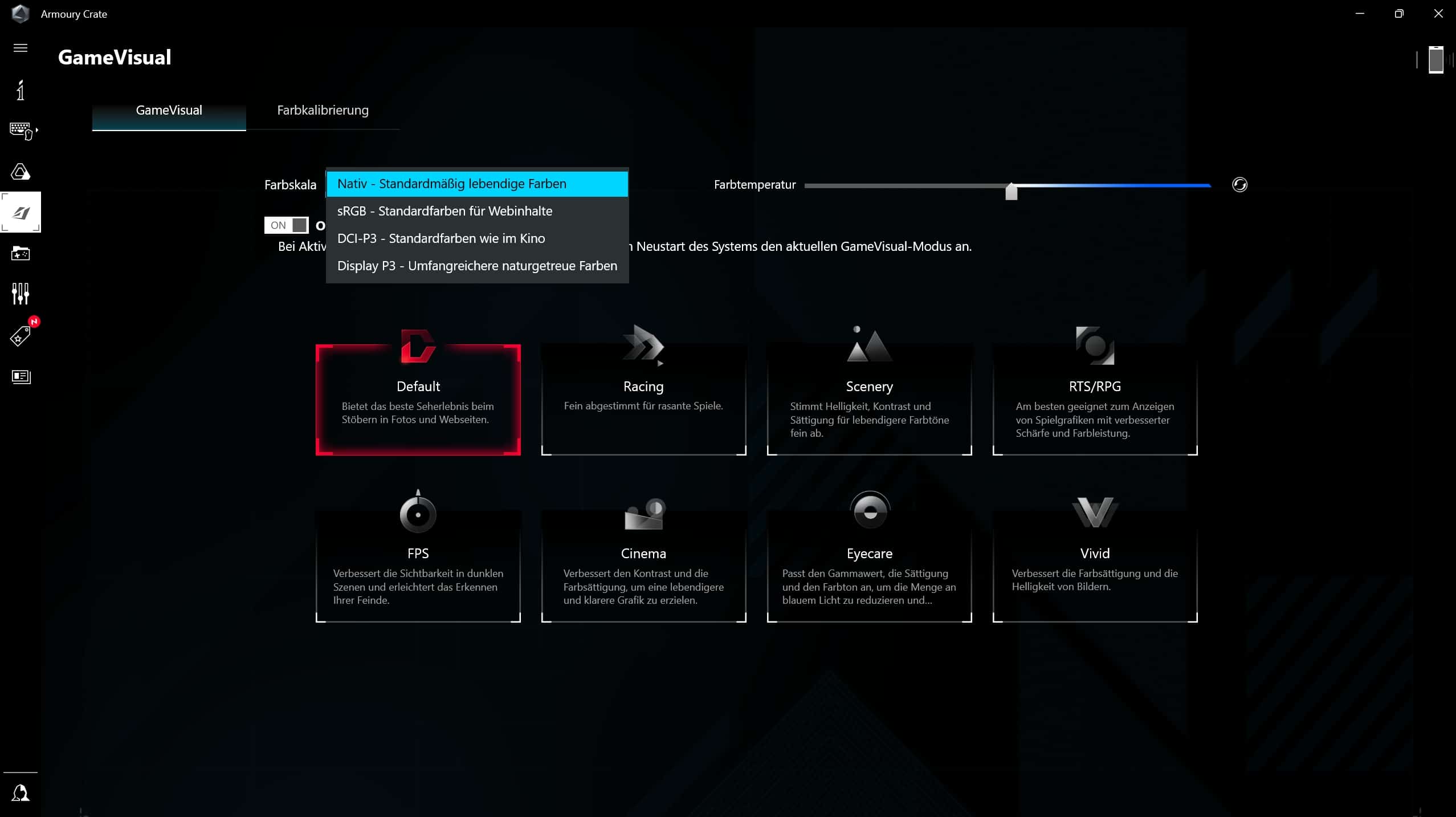 Im Standard-Profil wirken die Farben für unseren Geschmack jedoch etwas zu kräftig. Hier kannst du in der Armoury Crate-Begleitsoftware jedoch entgegenwirken. Hier stehen verschiedene Bildprofile, sowie Modi für unterschiedliche Genres zur Wahl, während auch eine Farbkalibrierung des Displays geboten wird.