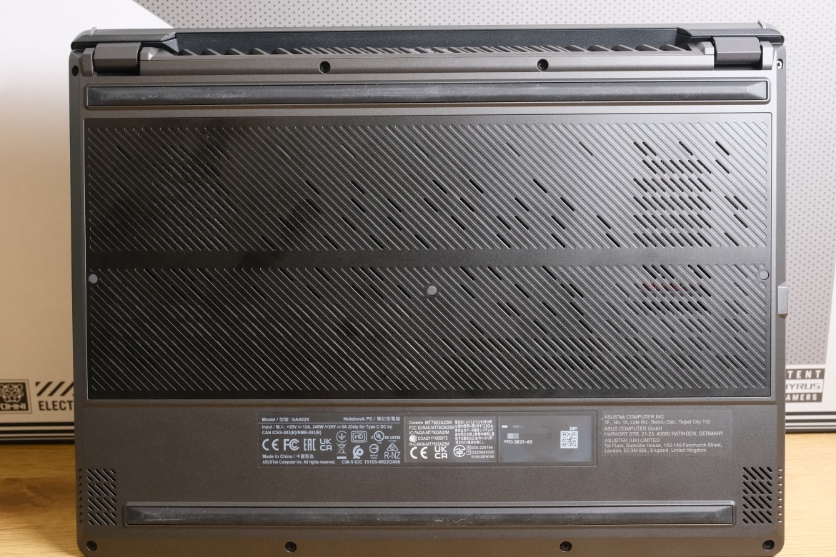 Luftauslässe und -eingänge erstrecken sich fast über die gesamte Unterseite des G14 und sind an beiden Seiten, sowie der Rückseite zu finden, was auf eine effektive Kühlung hoffen lässt. Unten finden sich zwei gummierte Standfüße über die gesamte Breite, während du mit Kreuzschlitz-Schrauben für die Wartung in das Innere gelangst.