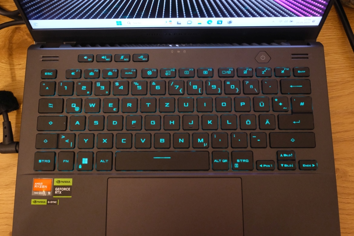 Das ASUS ROG Zephyrus G14 setzt auf eine Chiclet-Tastatur mit einem Tastenhub von rund 1,6 mm, die aufgrund des kompakten Gehäuses allerdings etwas zusammengestaucht werden müsste. Das Schreibgefühl kann auch bei längeren Texten definitiv überzeugen – nur an das gewöhnungsbedürftige Layout muss man sich erst einmal gewöhnen.
